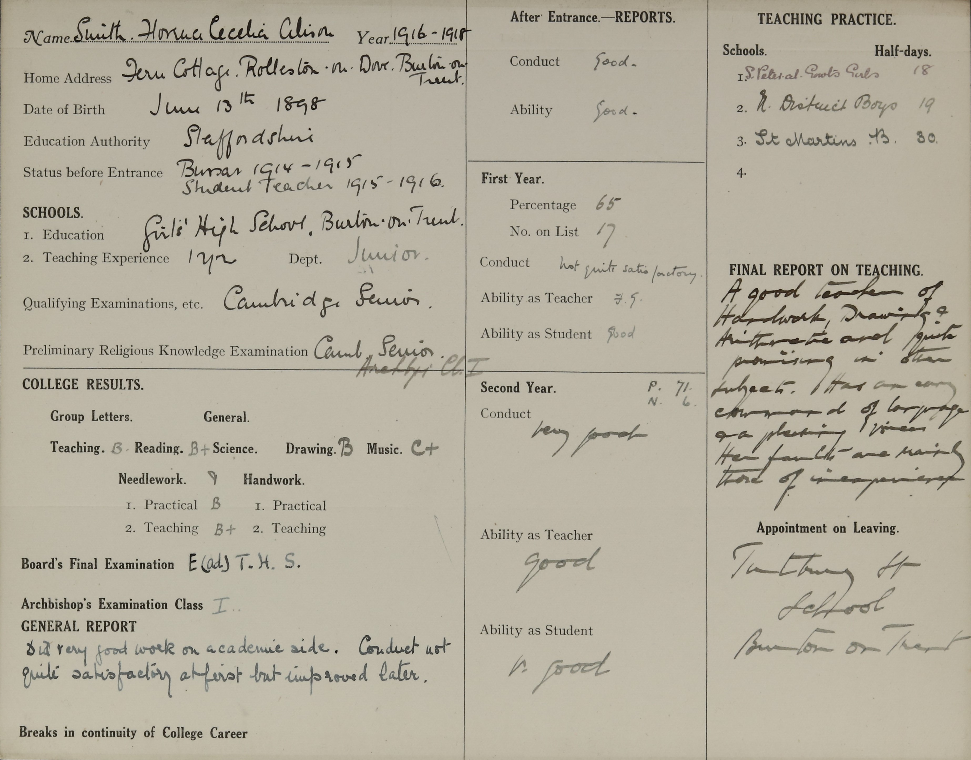 She is at Butts Lane, Norton Canes as a boarder. The head of the household, Hannah Baker (b. 1878), and her son, Harold William Baker (b. 1908), are unlisted. Florence is listed as a boarder and ‘Teacher’.