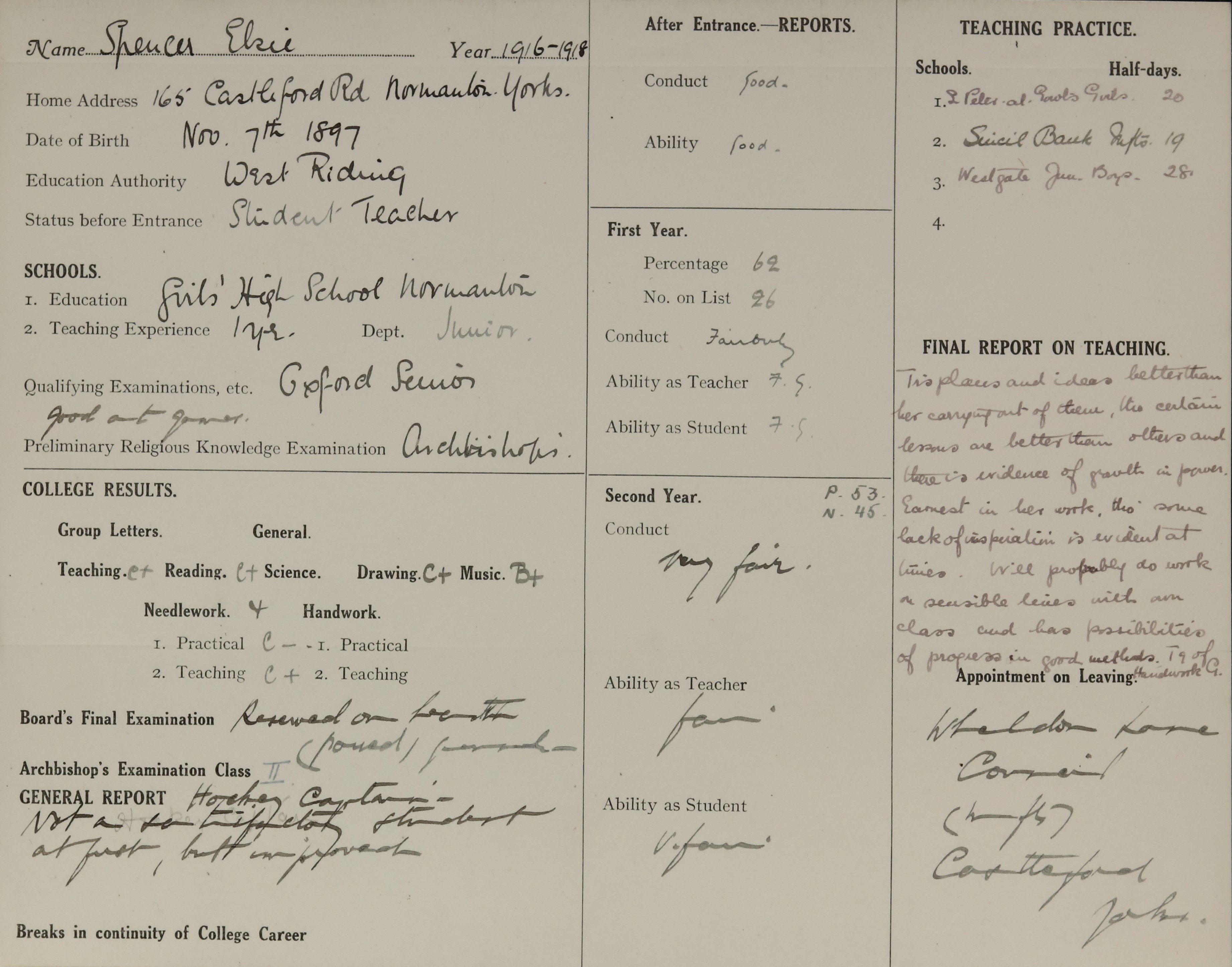 She is at 15 Castleford Road, Normanton. Her father and her cousin, James Clarence Hindley (b. 1896) are listed as ‘Miner Hewer’. Elsie is listed as ‘Elementary School Teacher’. Her brother, Walter, is listed as 'Soldier’. Her mother and sister, Ethel, are unlisted.