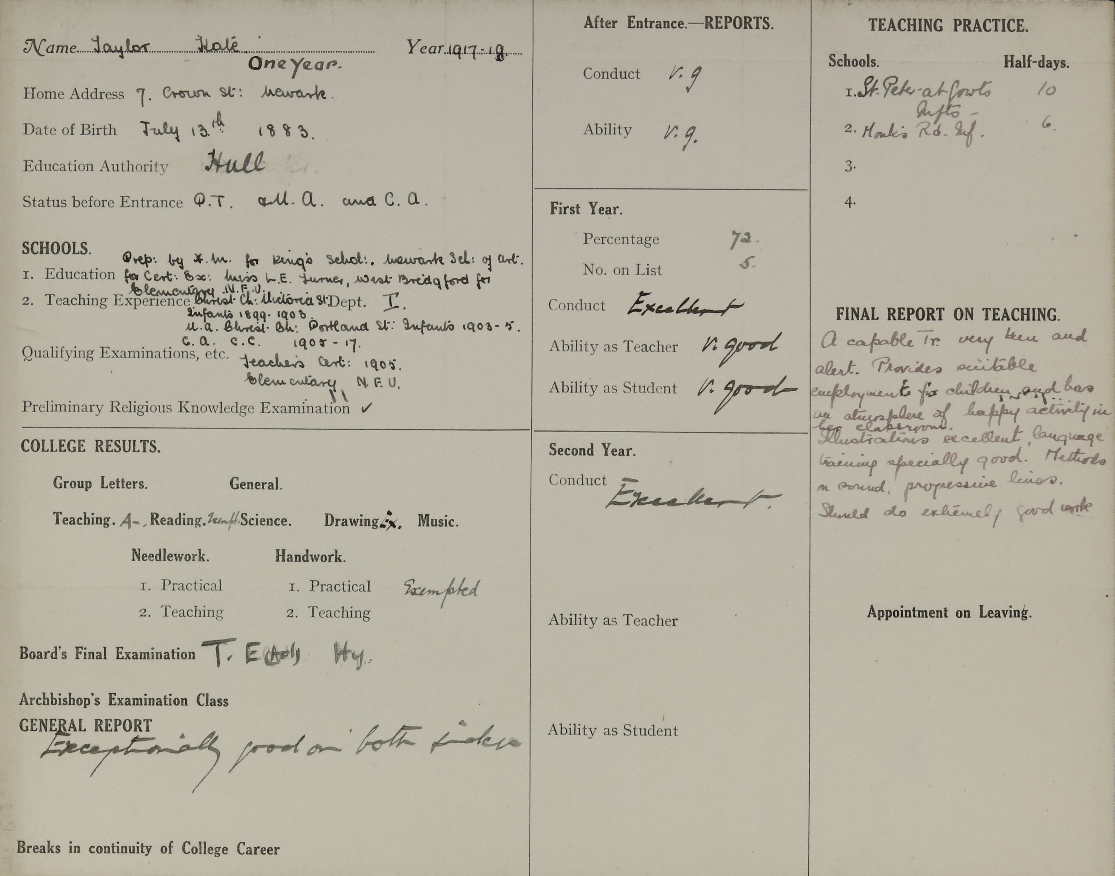 Listed as One Year Student but doesn’t get her first appointment until the 1917-1919 cohort, perhaps she stayed the full two years?