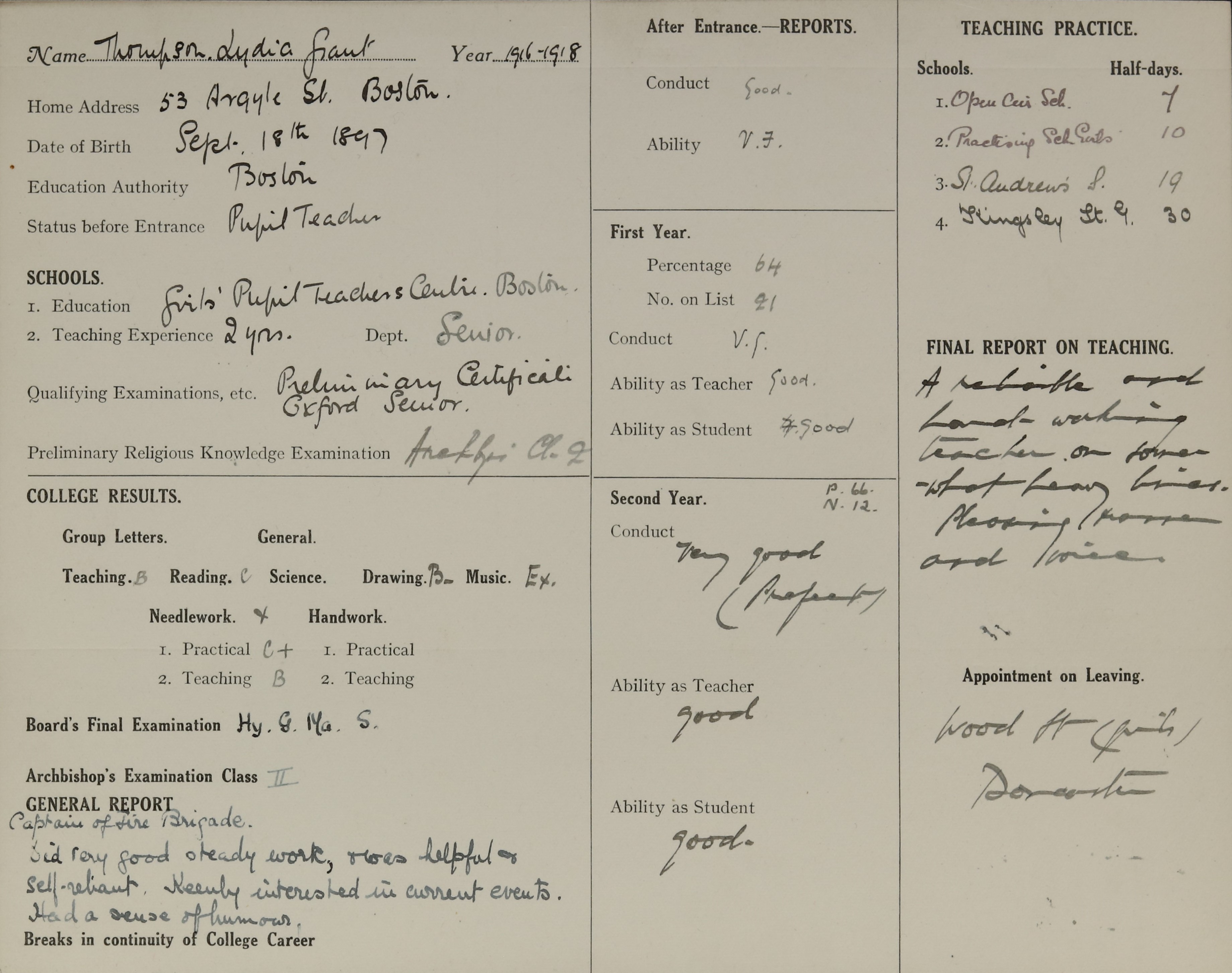 Qualification: Senior Oxford 1915, Prelim. Cert. 1916.