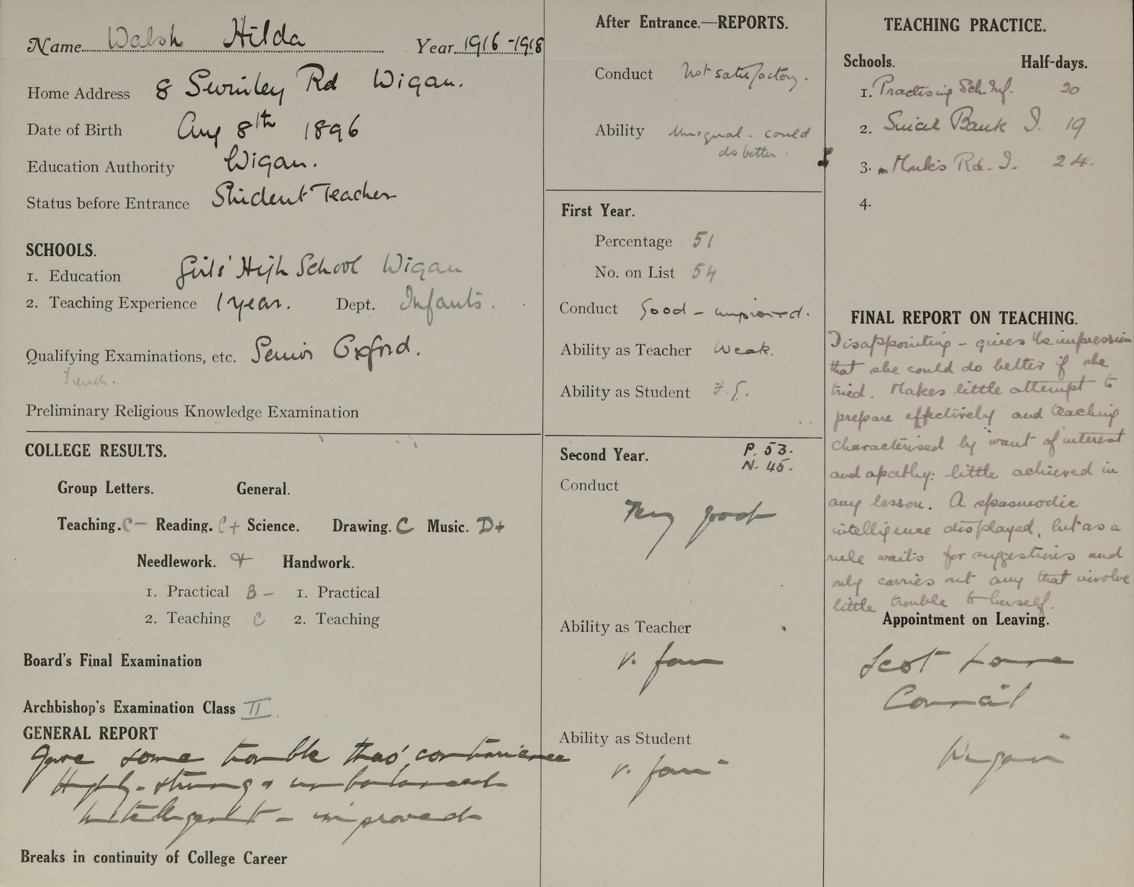 She is at 8 Swinley Road, Wigan. Her father is listed as ‘Trade Union Agent Lancashire and Cheshire Miners’. Her sister, Ada, is listed as ‘Certificated Teacher Elementary School’. Her sister, Emma, is listed as ‘Domestic Service’. Her brother, Arthur, is listed as ‘Student Manchester University’. Hilda, her mother and siblings, Eva, Vera, Wilfrid, Leslie and Leonard, are unlisted.