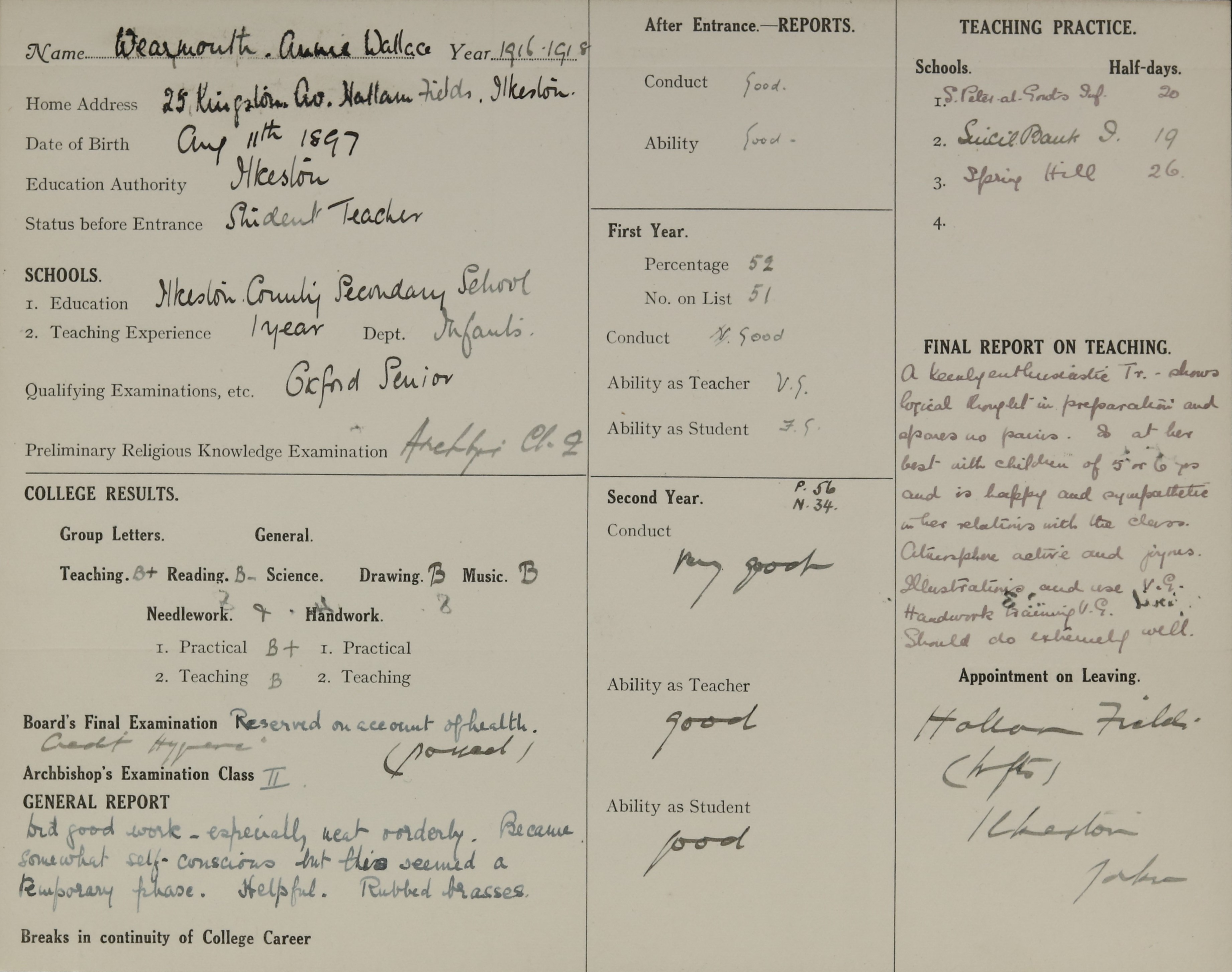 Her name on Record Card says ‘Annie Wallace Wearmouth’ but unable to trace where this comes from.