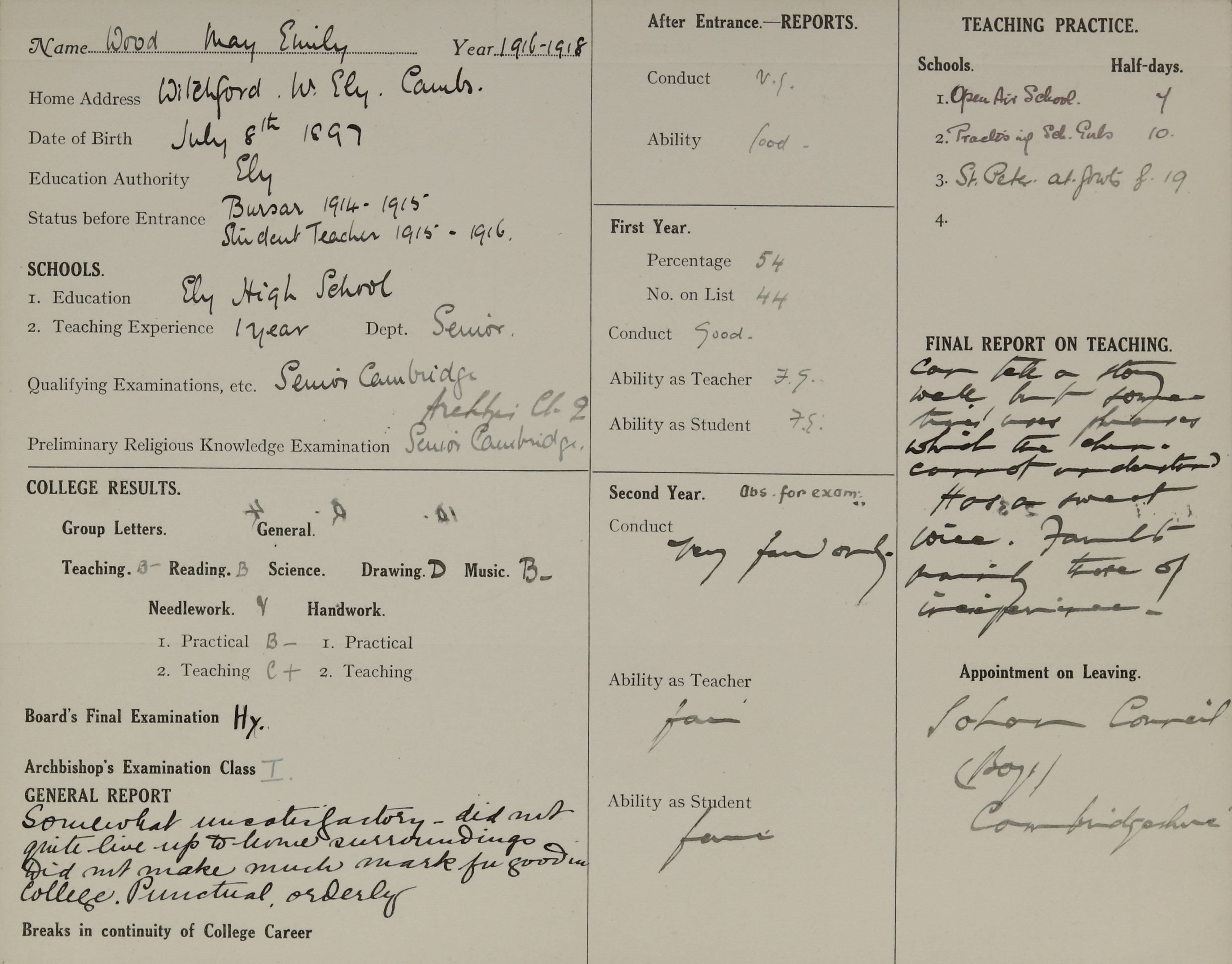 She is at Witchford, Ely. Her father is listed as ‘Grocer’. May is listed as ‘Elementary Teacher’.
