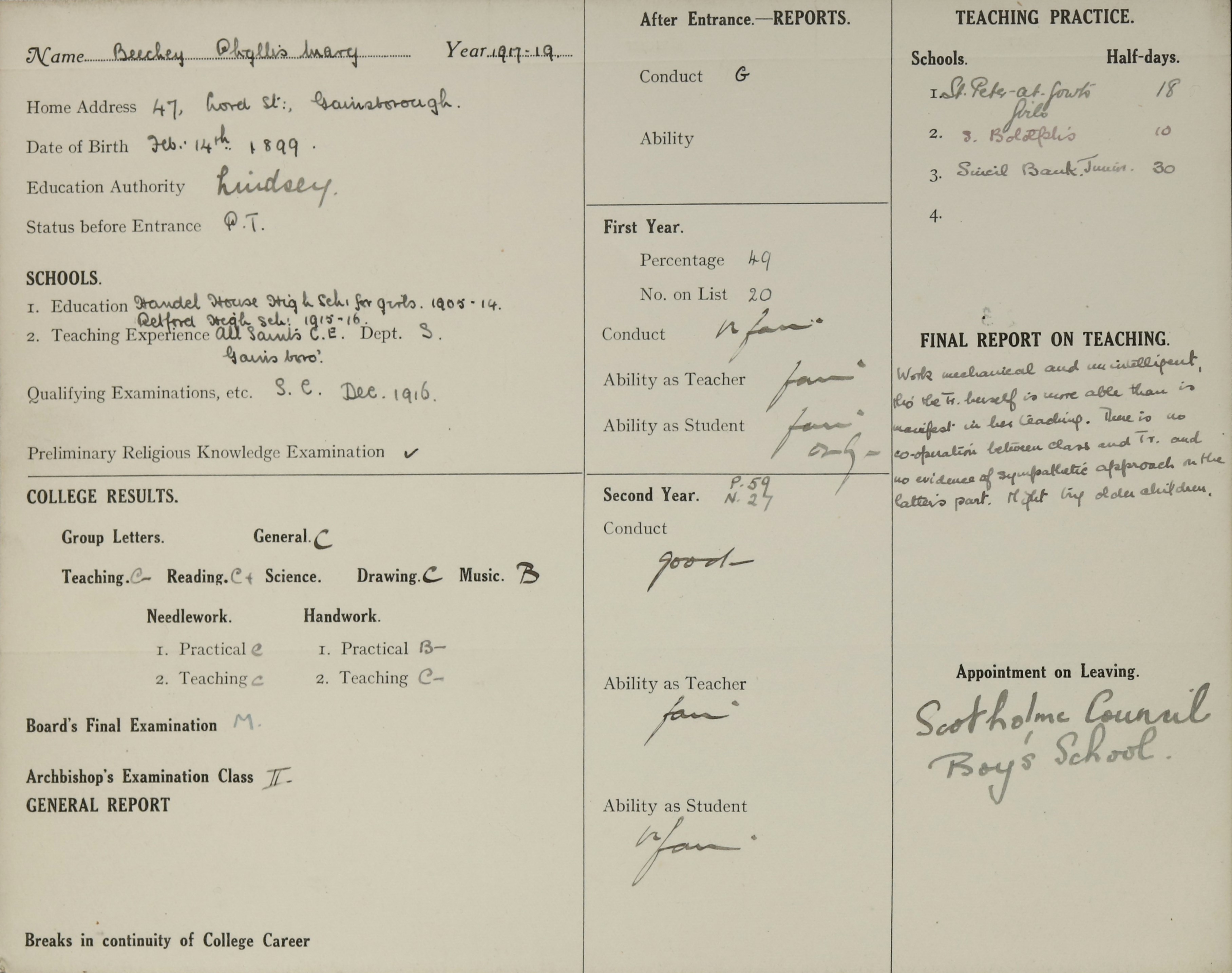 Appointed to Scotholme Council Boys, Notts.
