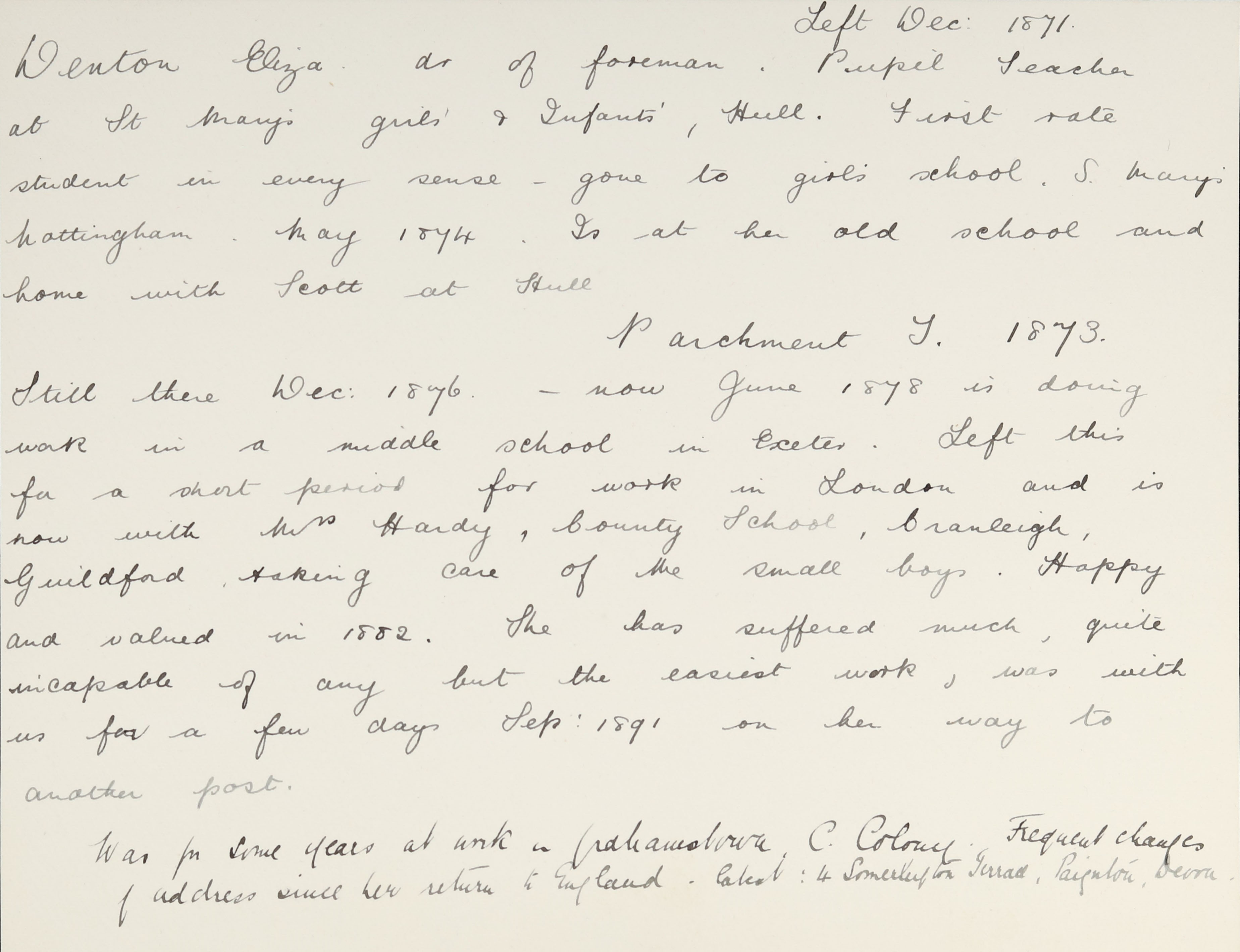 There is a record at St Peter’s Memorial Home for Patients in Woking that records an admission on 16 November 1888 for Eliza Denton, a schoolmistress from Cranleigh.