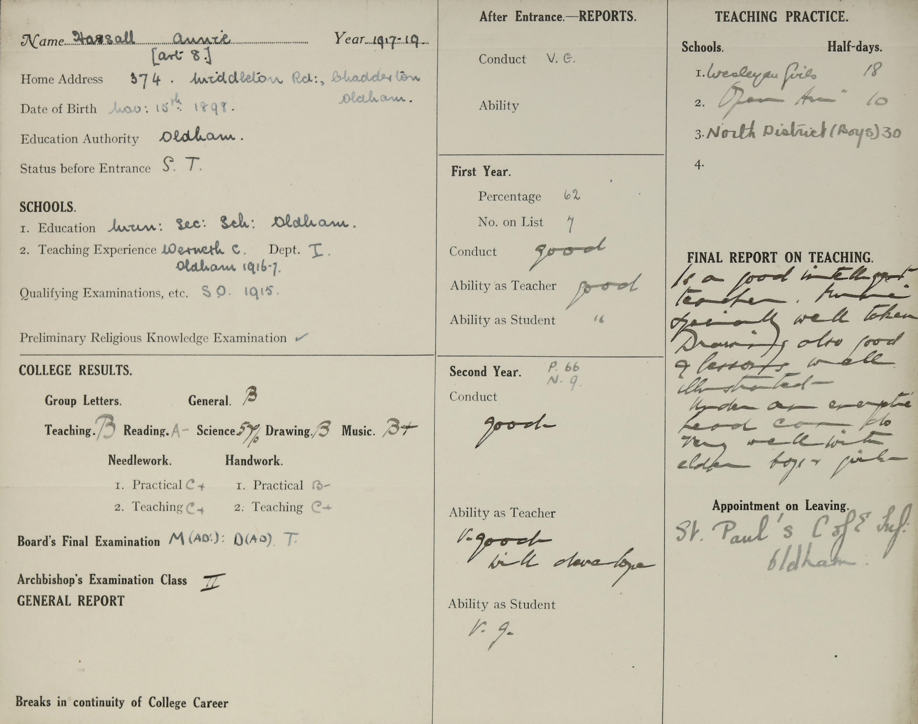 Appointed to St. Paul's C. of E. Infants, Oldham.