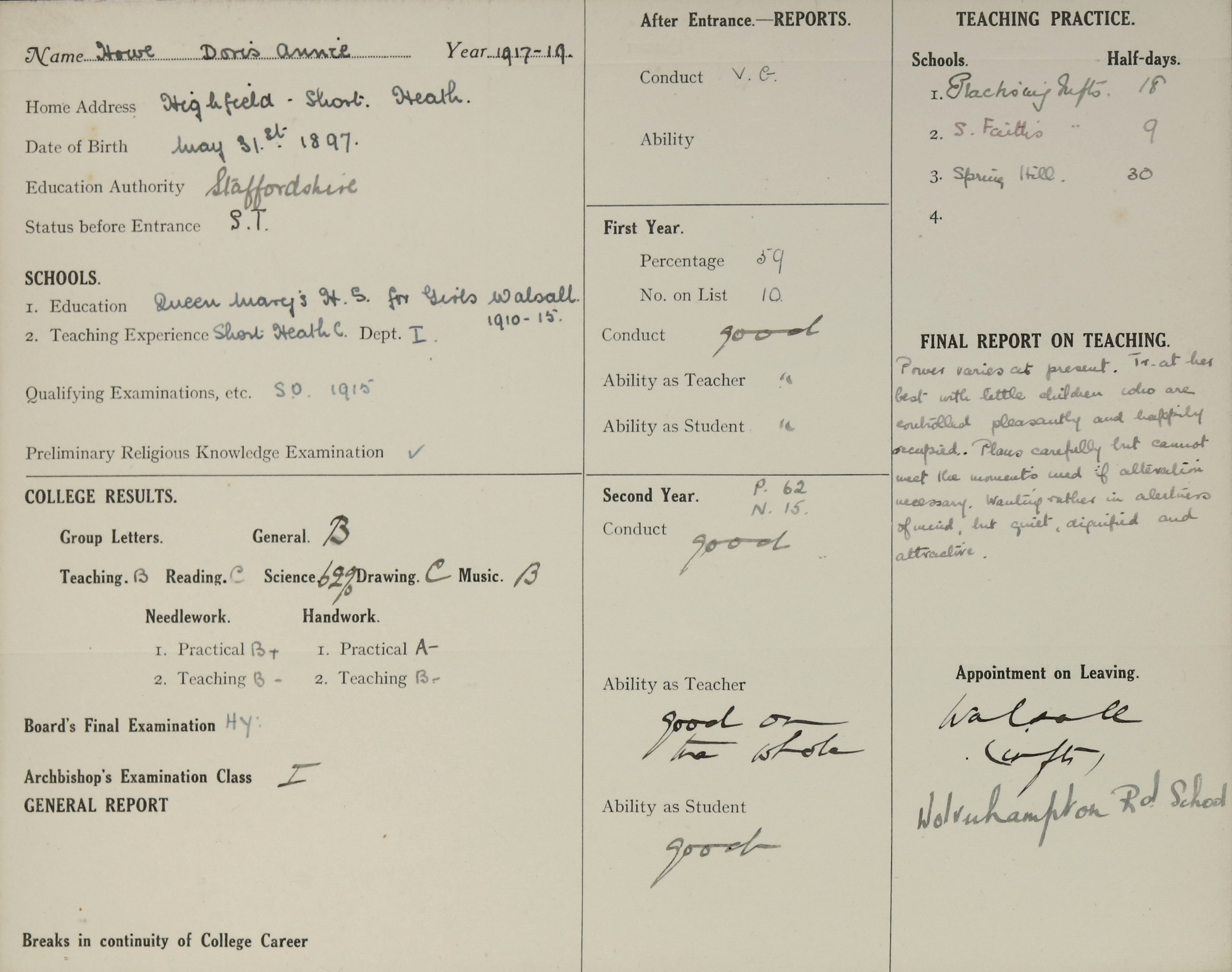 Appointed to Wolverhampton Road Infants, Walsall.