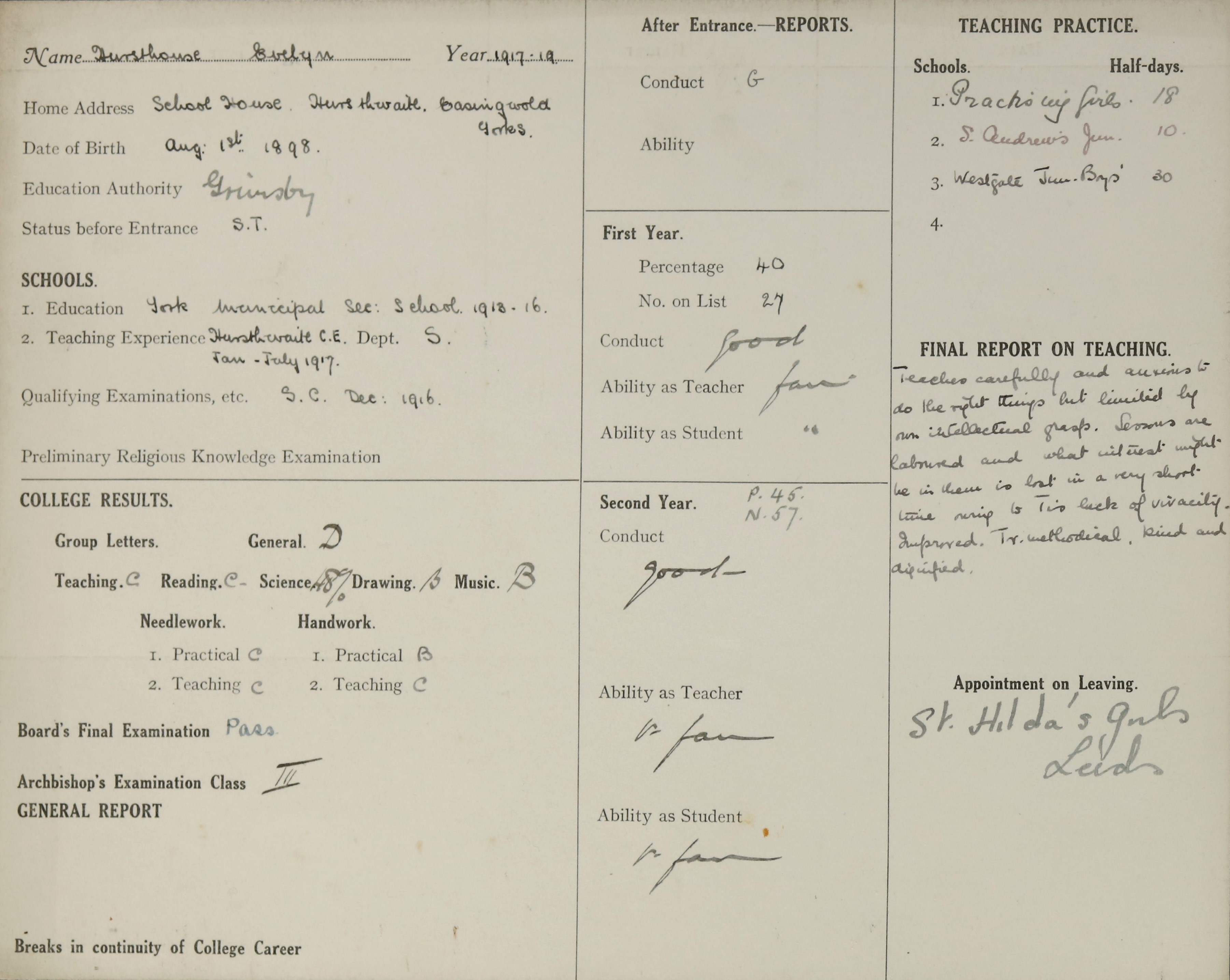 She is at Husthwaite, Easingwold. Her father is listed as ‘Schoolmaster Elementary’. Her mother is listed as ‘Assistant Schoolmistress Elementary’. Evelyn and her sisters, Adelaide and Mabel, are unlisted.
