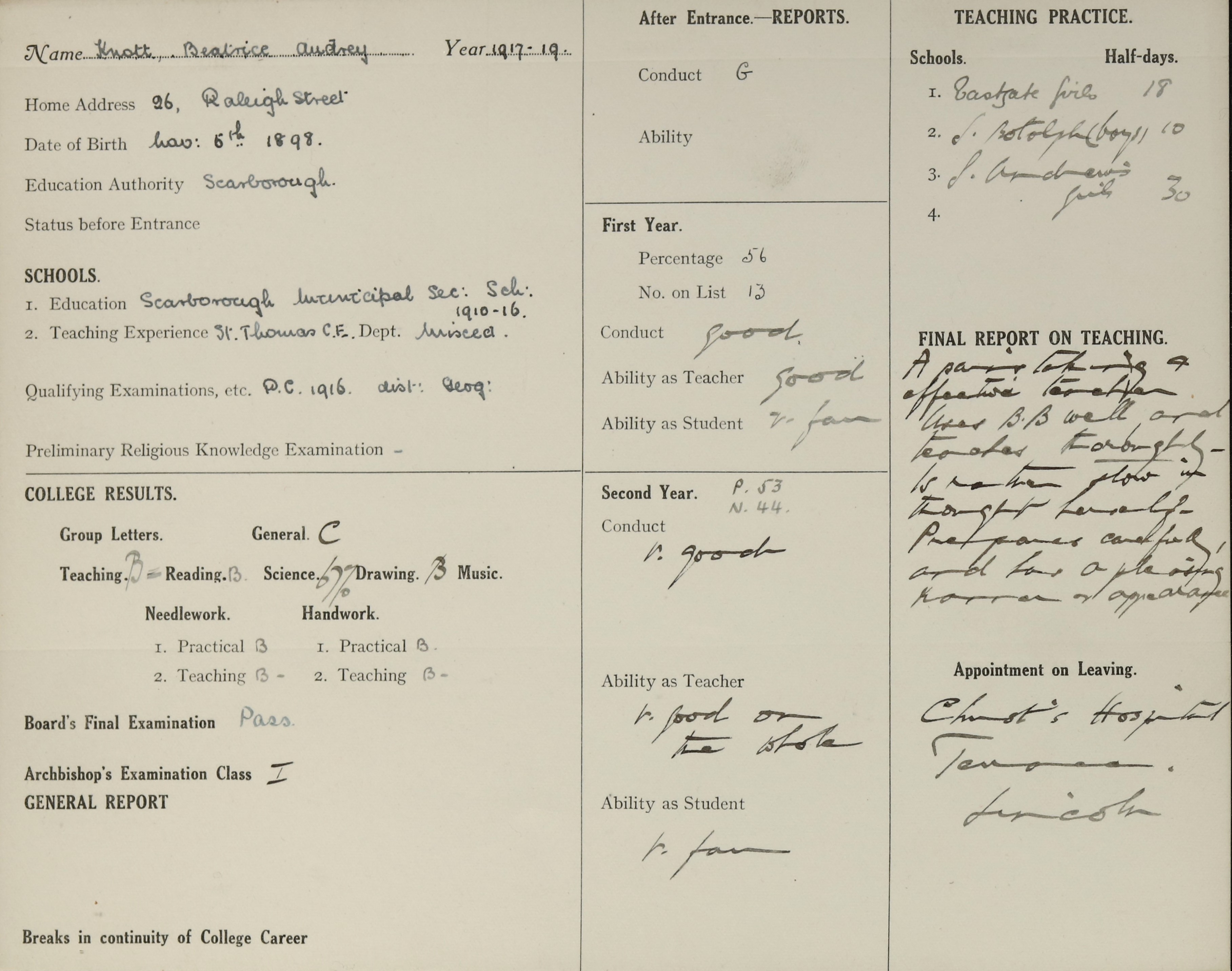 She is at 26 Raleigh Street, Scarborough. Her father is listed as ‘Printer’s Compositor’. Beatrice, her mother and her cousin, Maria Knott (b. 1888), are unlisted. Her maternal grandmother, Fanny Morgan (b. 1823), is listed as ‘Retired Monthly Nurse’.