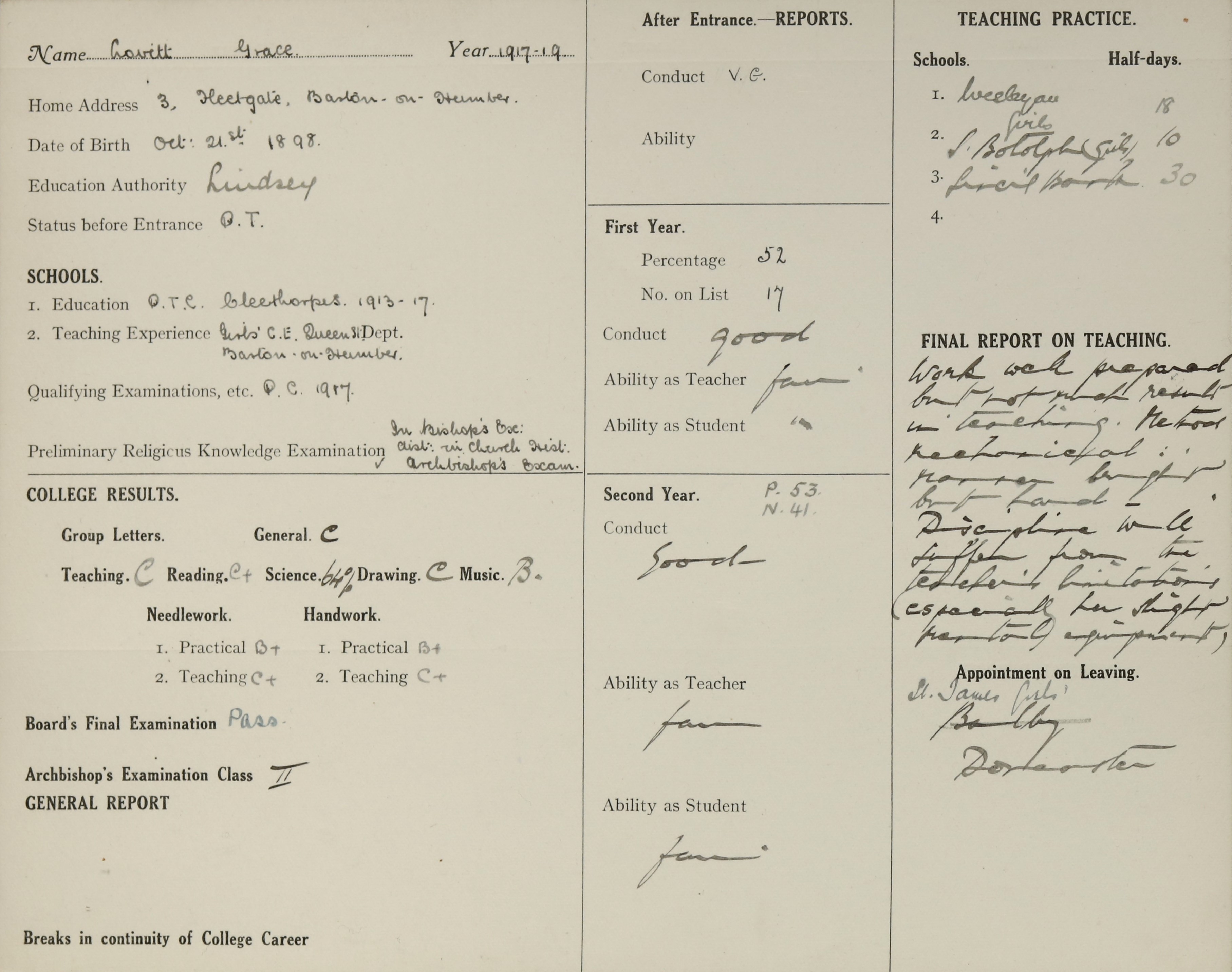 She is at Ancaster, Wilsford, Lincolnshire as a visitor. The head of the household, Clement John Barker (b. 1868), is listed as ‘Farmer’. His wife, Elizabeth Barker (b. 1869), is listed as ‘Domestic Work’. Their daughter, Mary Barker (b. 1899), is listed as ‘Assistant Teacher Elementary’. Their sons, Hugh Barker (b. 1900) and Robert Barker (b. 1903), are listed as ‘Assisting Farm Work’. Grace is listed as a visitor and ‘Elementary Assistant School Teacher’.