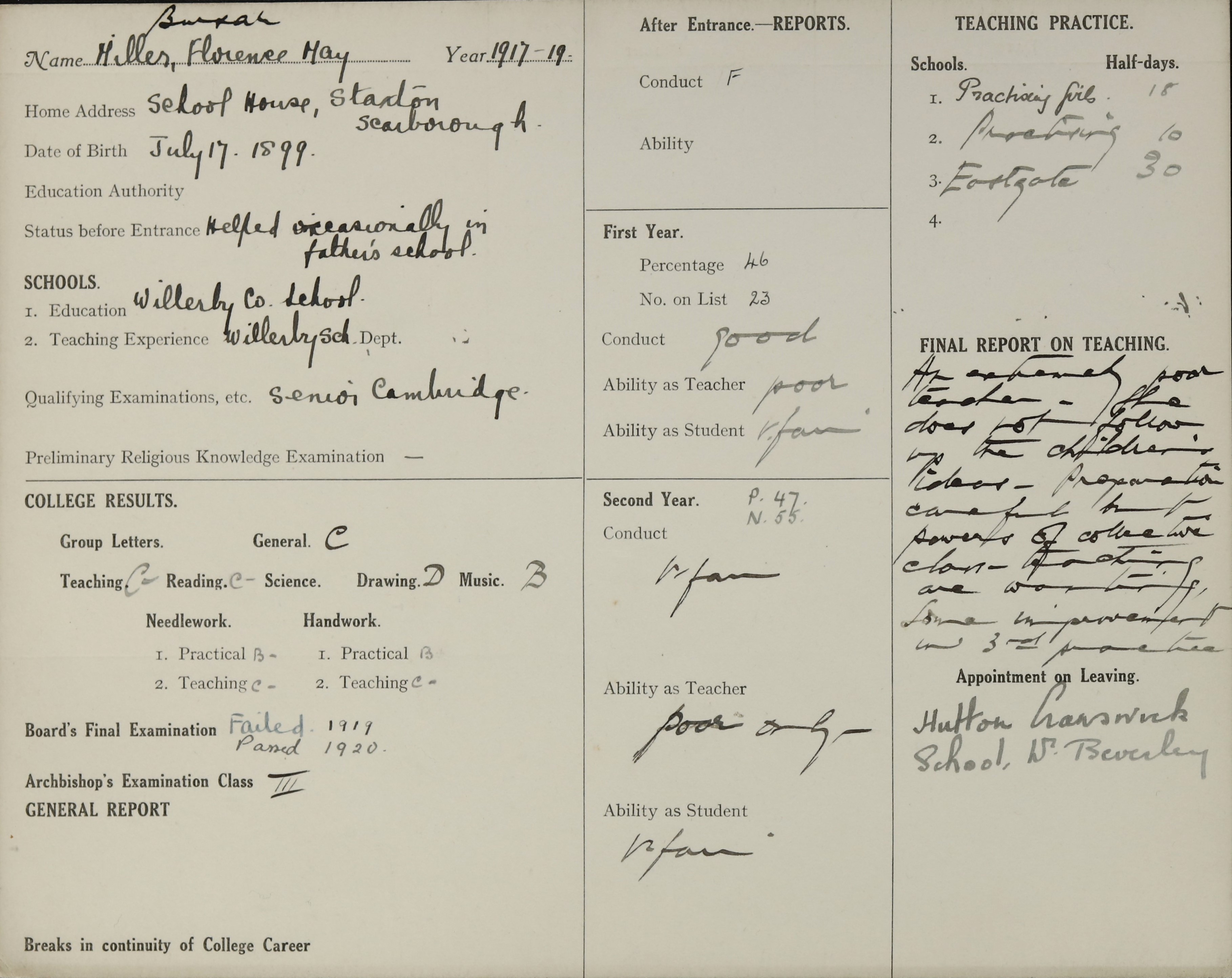 She is at Staxton, Ganton, York. Her father is listed as ‘Head Teacher Elementary School’. Her mother is listed as ‘Teacher Elementary School’. Her sister, Jane, is listed as ‘Student Civil Service’. Florence and her siblings, Emma, William, Edgar, Athelstan, Catherine, Edith, Lawrence and Hester are unlisted.