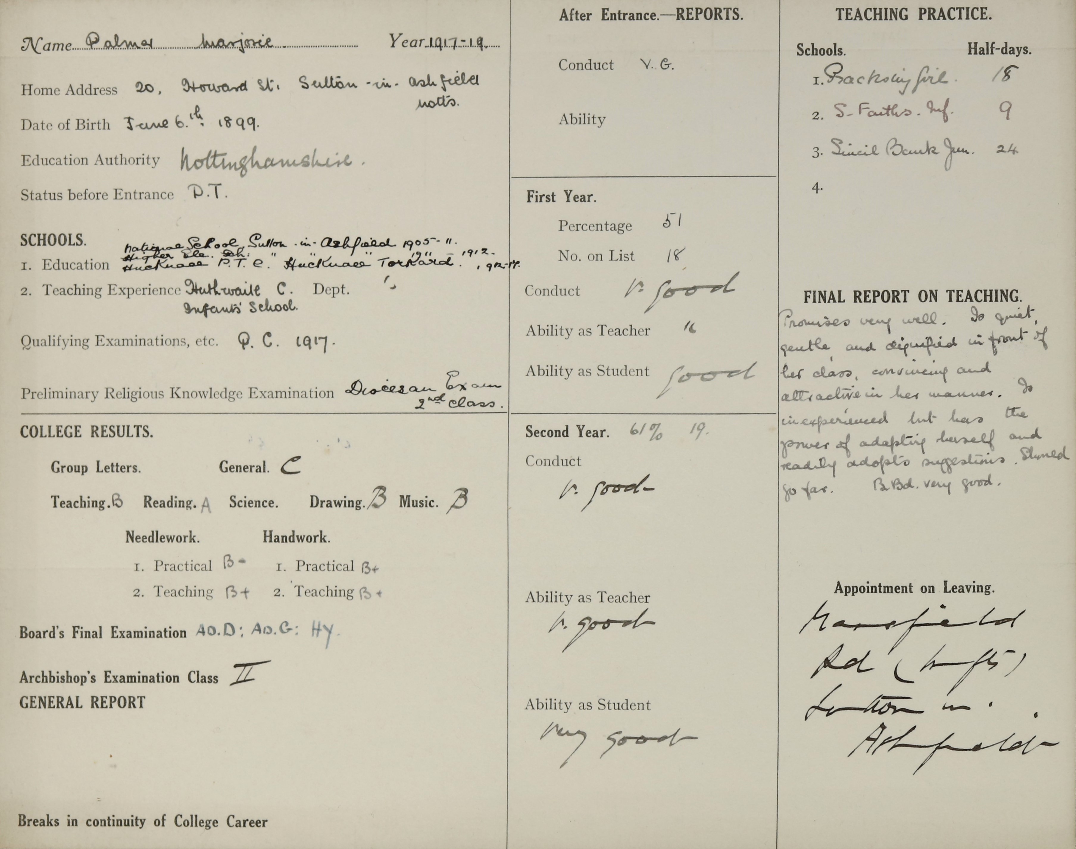 She is at 20 Howard Street, Sutton in Ashfield. Her father is listed as ‘Under Manager Hosiery Factory Warehouseman’. Her mother is unlisted. Her sister, Clarice, is listed as ‘Dressmaker Assistant’. Marjorie is listed as ‘Certificated Assistant Teacher’.