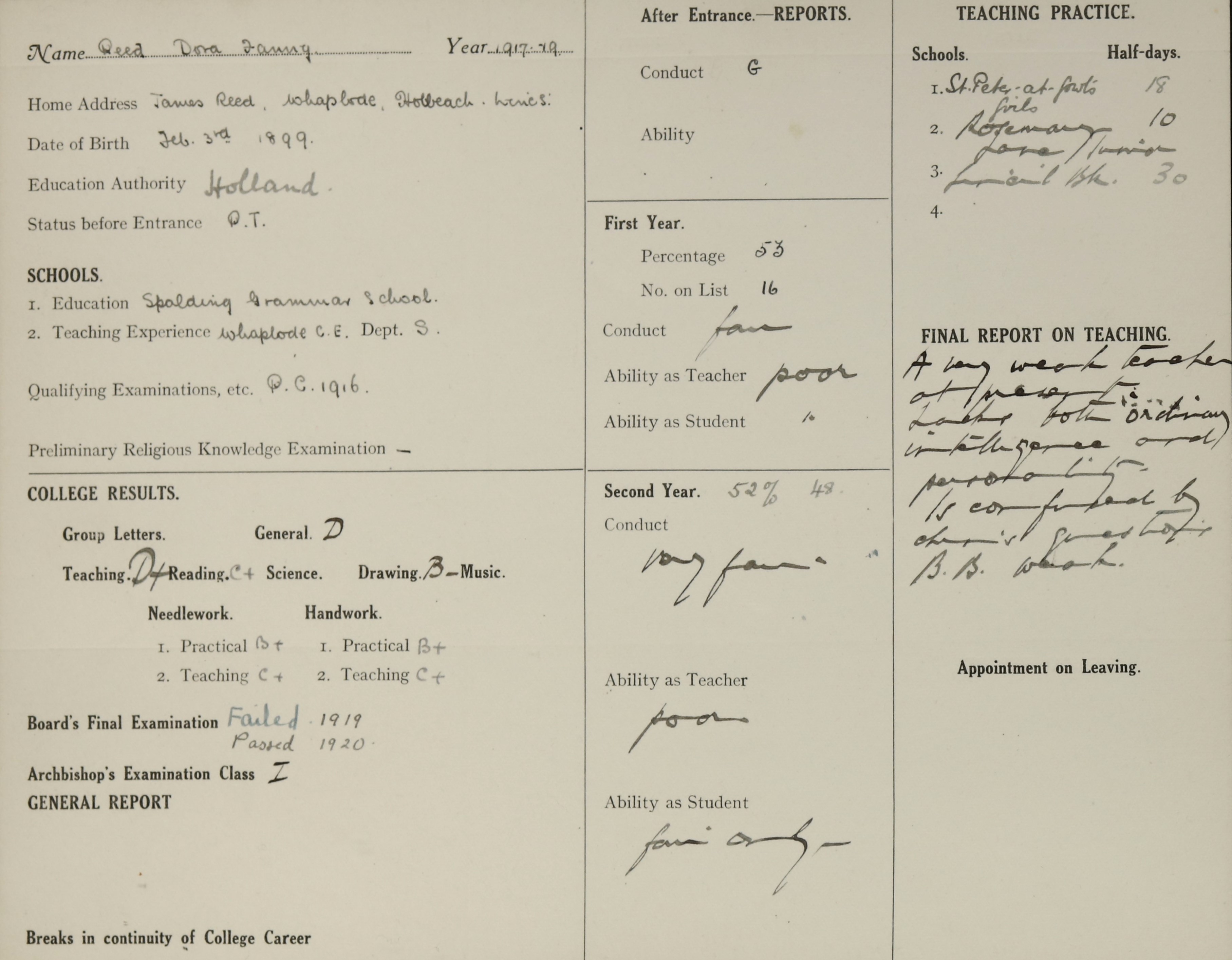 She is at Linden Farm, Whaplode. Her father and brother, Thomas, are listed as ‘Farmer’. Her mother and sister, Alma, are unlisted. Dora is listed as ‘School Mistress’.
