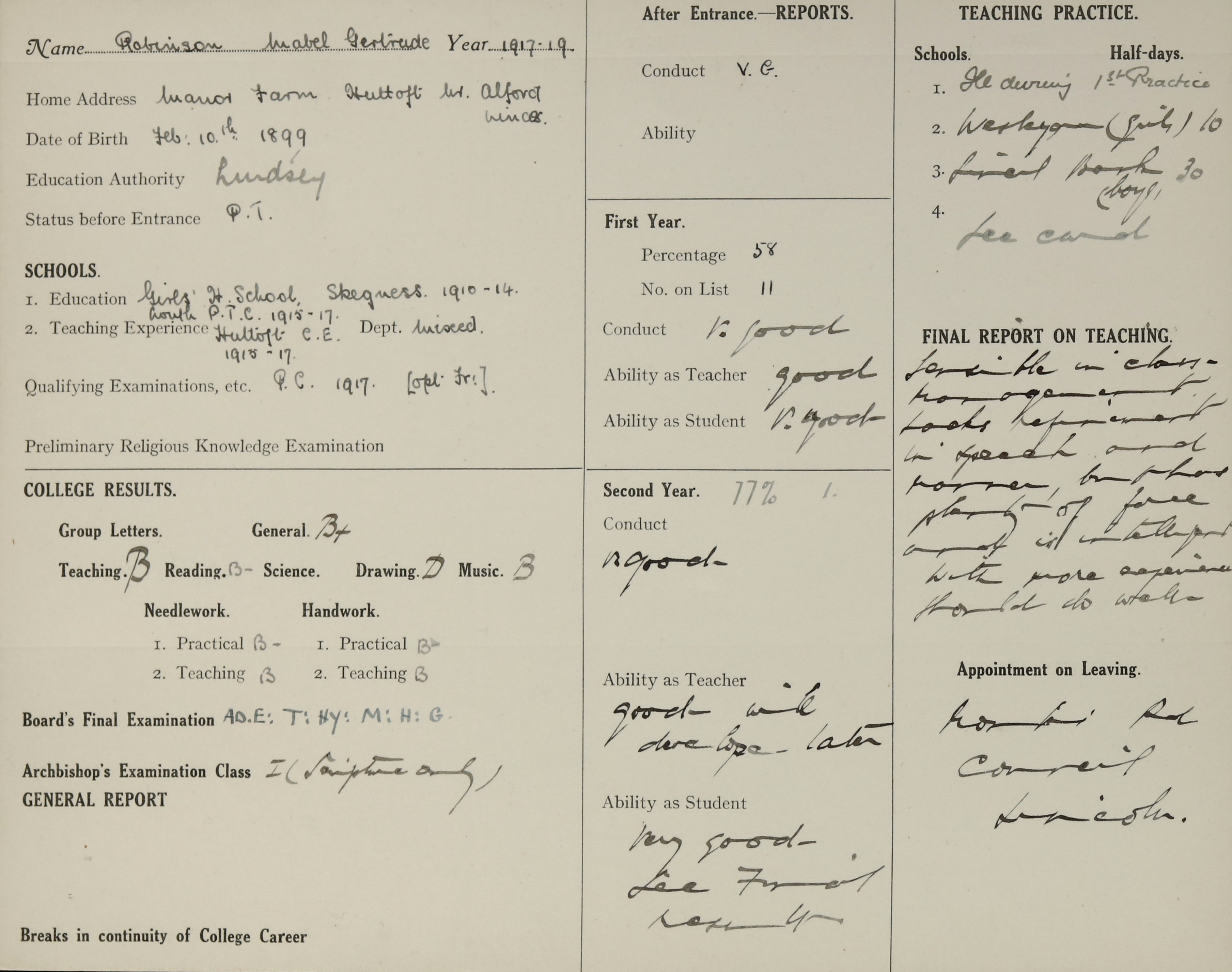 She is at 68 Hewson Road, Lincoln as a boarder. The head of the household, Thomas Henry Enderby (b. 1860), is listed as ‘Grocer’. His daughter, Thirza Ethelwyn Enderby (b. 1890), is listed as ‘Sick Room Caretaker’. Mabel is listed as boarder and ‘School Teacher’.
