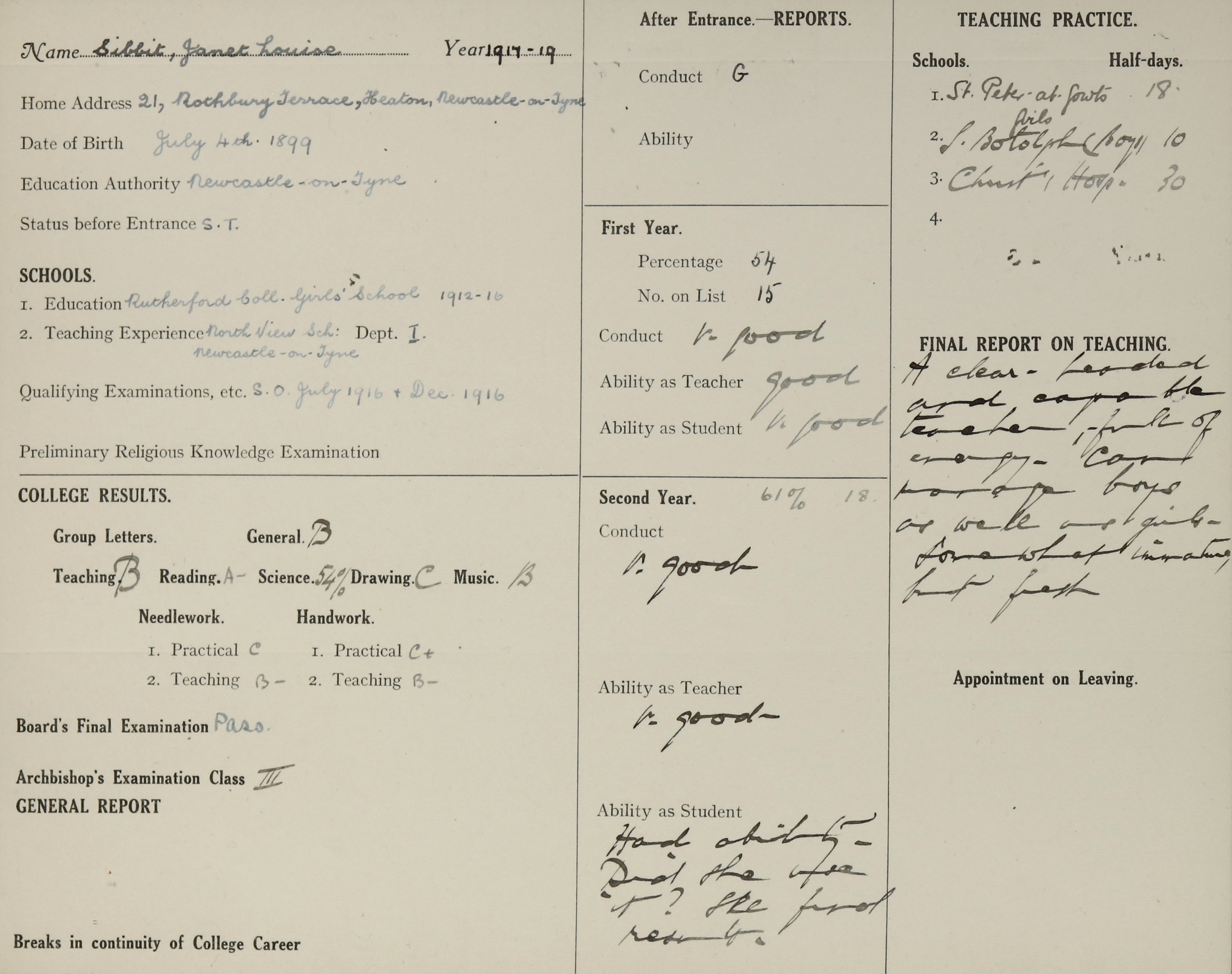 She is at 26 Rothbury Terrace, Heaton, Newcastle upon Tyne. Her mother is unlisted. Janet is listed as ‘Teacher’.