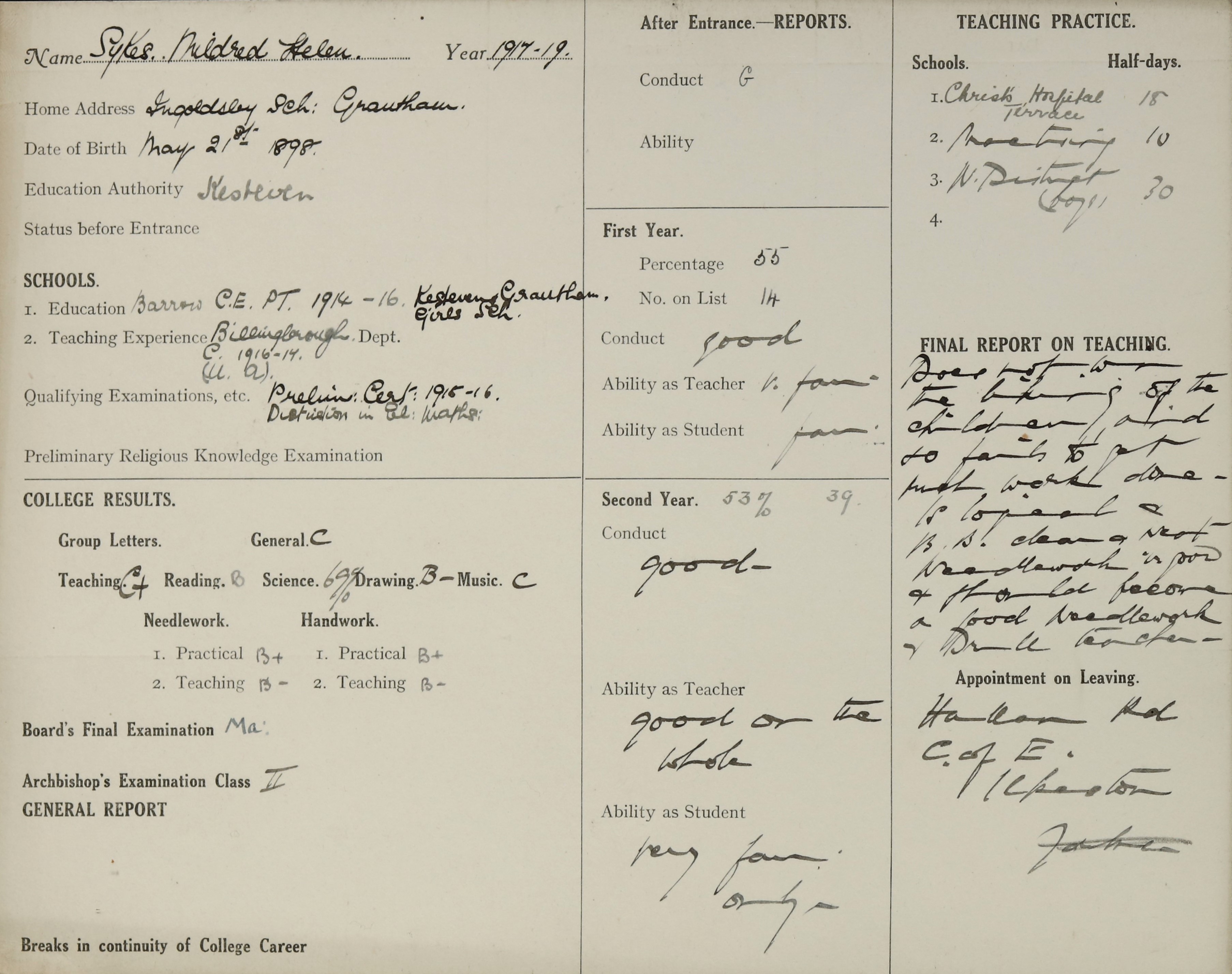 She is at The School, Lenton Road, Ingoldsby. Her father is listed as ‘Elementary Schoolmaster’. Her mother and sister, Beatrice, are listed as ‘Elementary Assistant Mistress’. Her sister, Emily, is listed as ‘Daily Governess’. Mildred and her sister, Winifred, are unlisted.