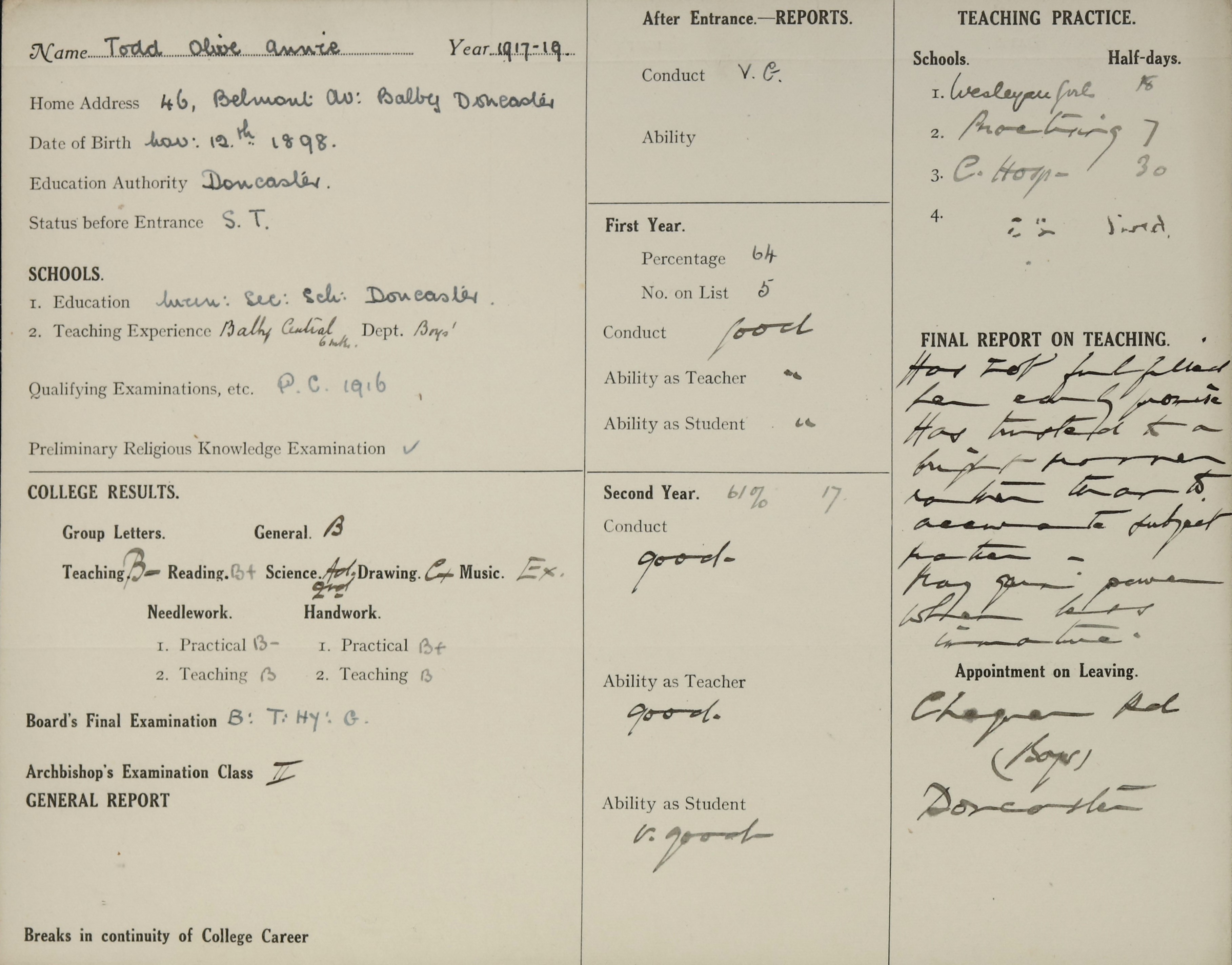 She is at 46 Belmont Avenue, Balby, Doncaster. Her father is listed as ‘Railway Guard’. Olive is listed as ‘Elementary Teaching’. Her mother and sister, Mary, are unlisted. Her brother, Ralph, is listed as ‘Electric Wiring Apprentice’.