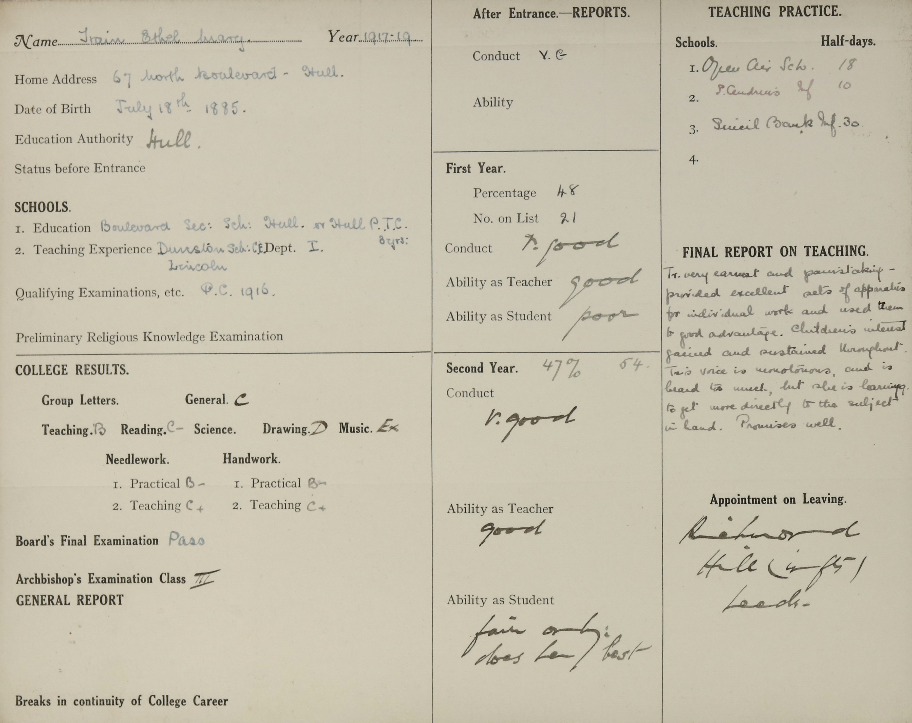 Appointed to Richmond Hill Infants, Leeds.