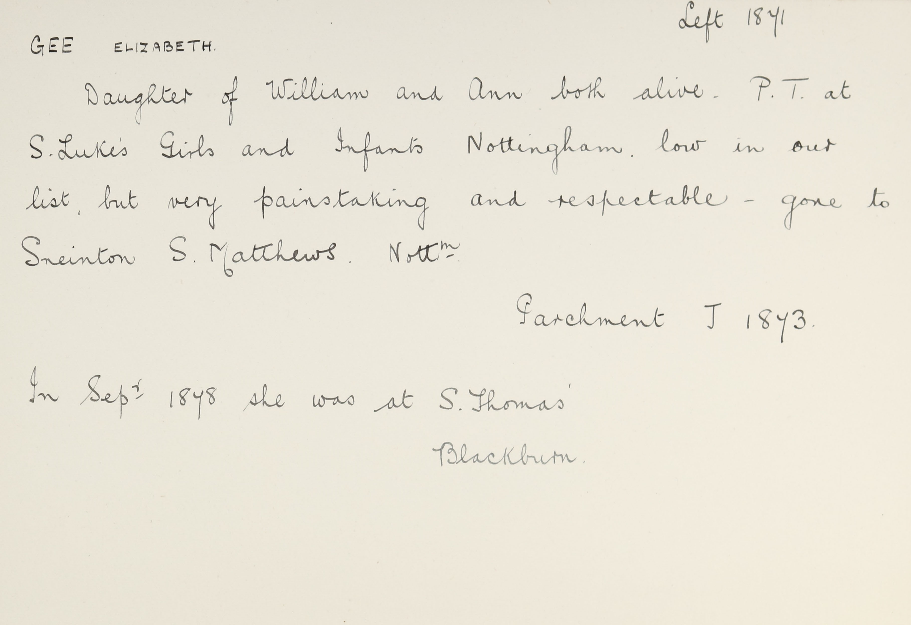 She is at 15 West Street, Sneinton, Radford. Her mother and father are listed as ‘Framework Knitters’. Elizabeth and her siblings (John, Sarah, William, Joseph) are unlisted.