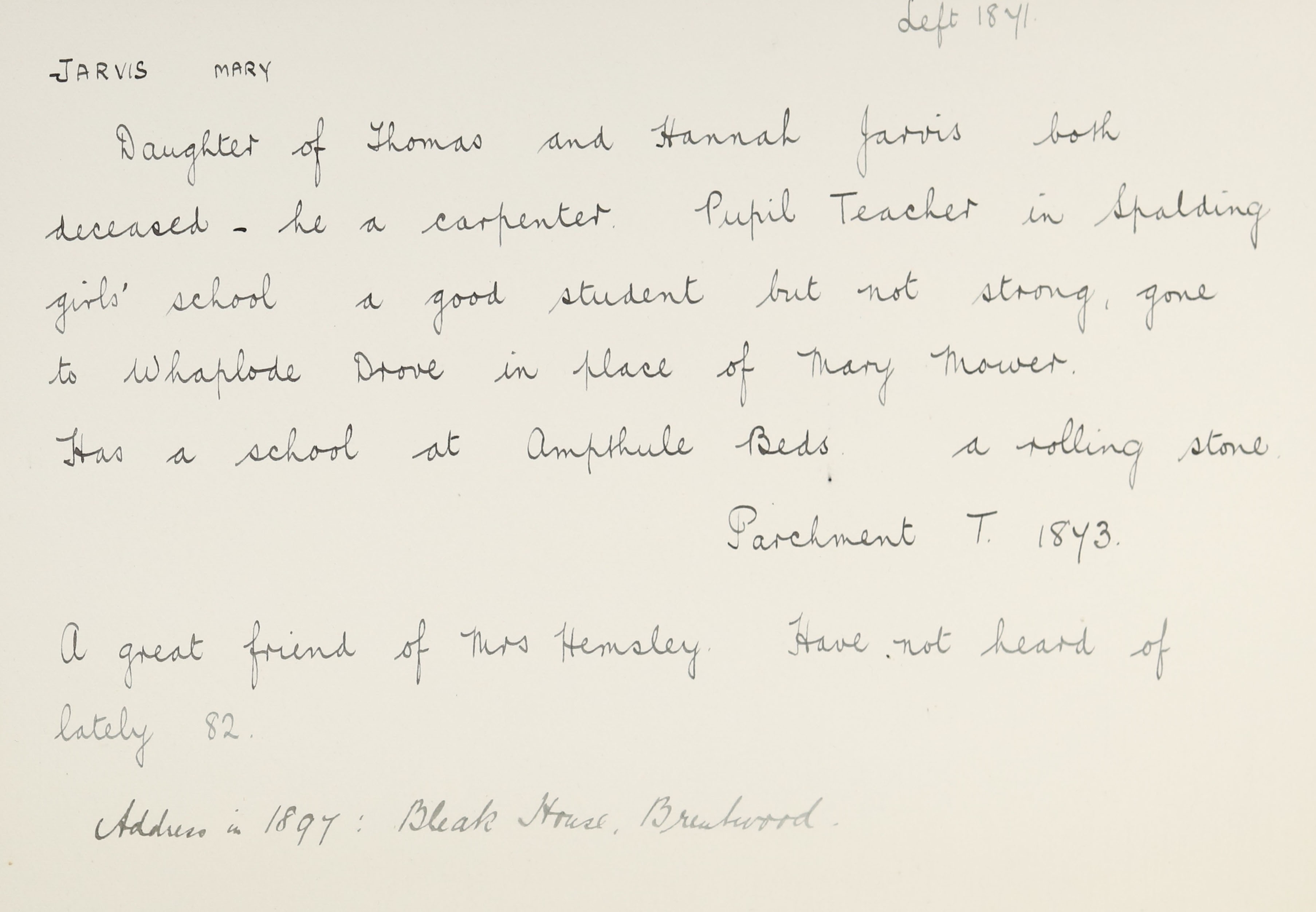 She is at Bourn Road, Spalding. Her father is listed as ‘Carpenter’. Mary and her mother are unlisted.