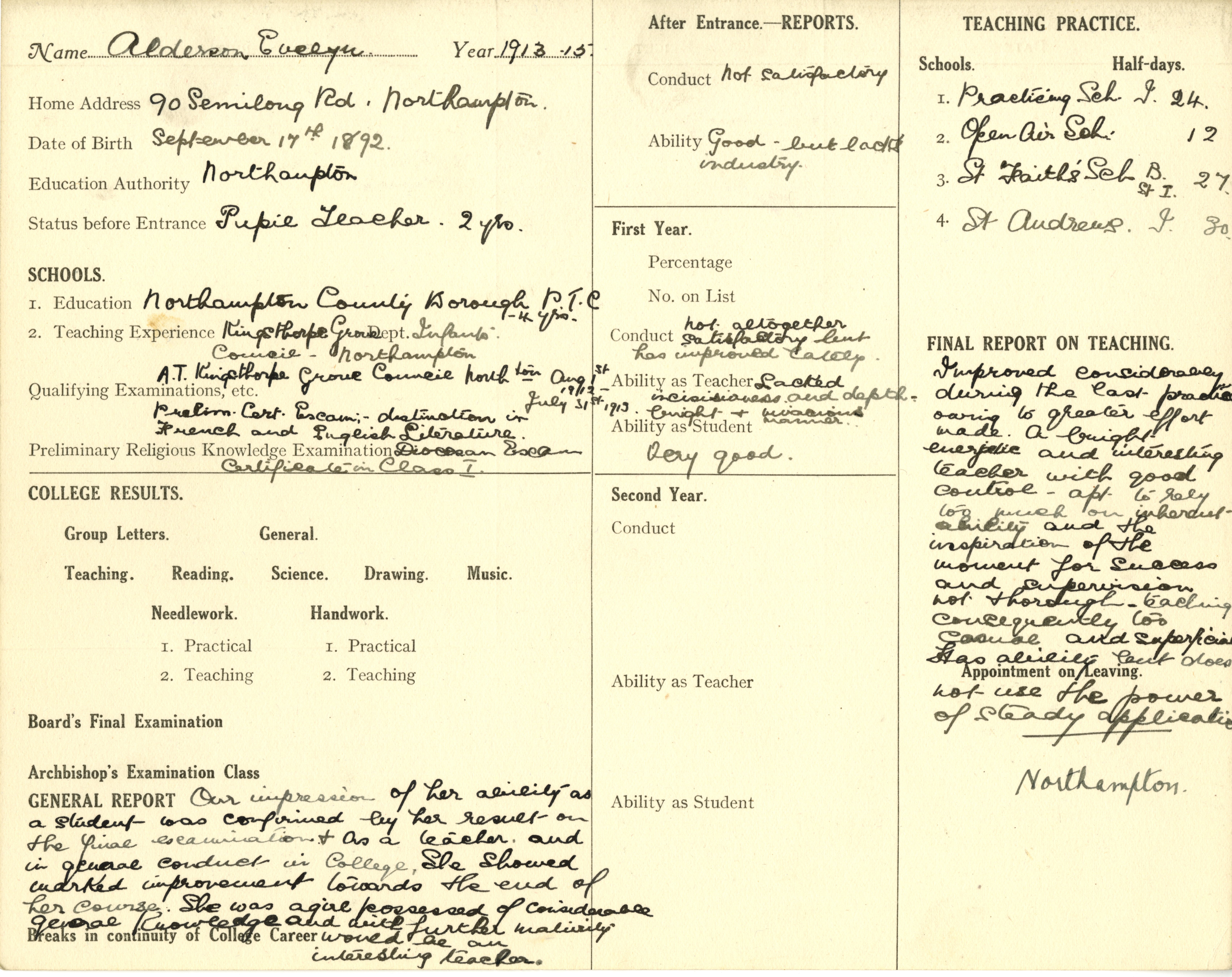 She is at 90 Semilong Road, Kingsthorpe, Northamptonshire. Her father is listed as ‘Inspecting Engineer’. Her mother and brother, Charles, are unlisted. Her brother, George, is listed as ‘Journalist’. Her sister, Mary, is listed as ‘Typist Clerk’. Evelyn is listed as ‘Pupil Teacher’.