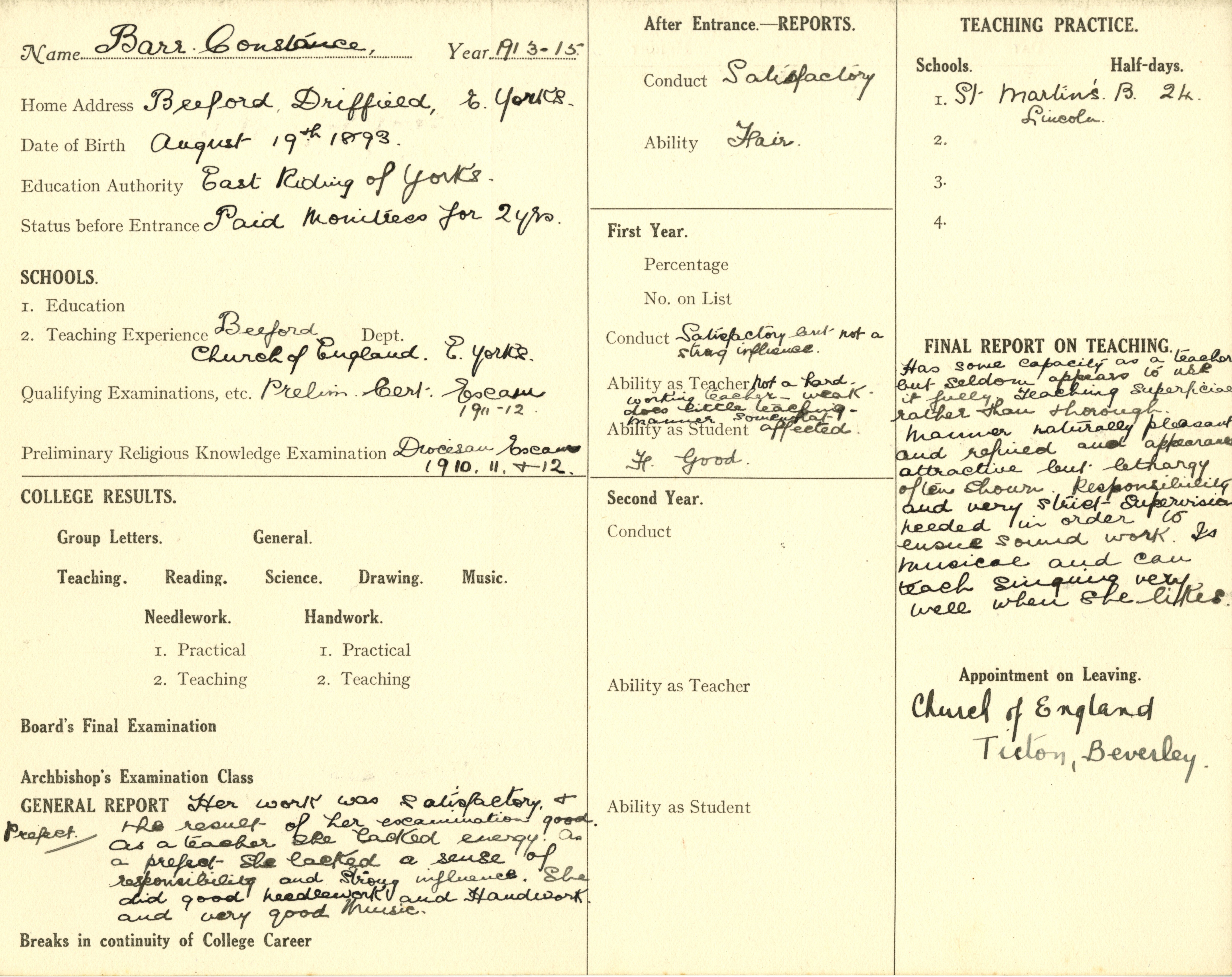She is at Beeford, Driffield. Her father is listed as ‘Bricklayer’. Her mother is unlisted. Constance is listed as ‘Monitress in Elementary School’.