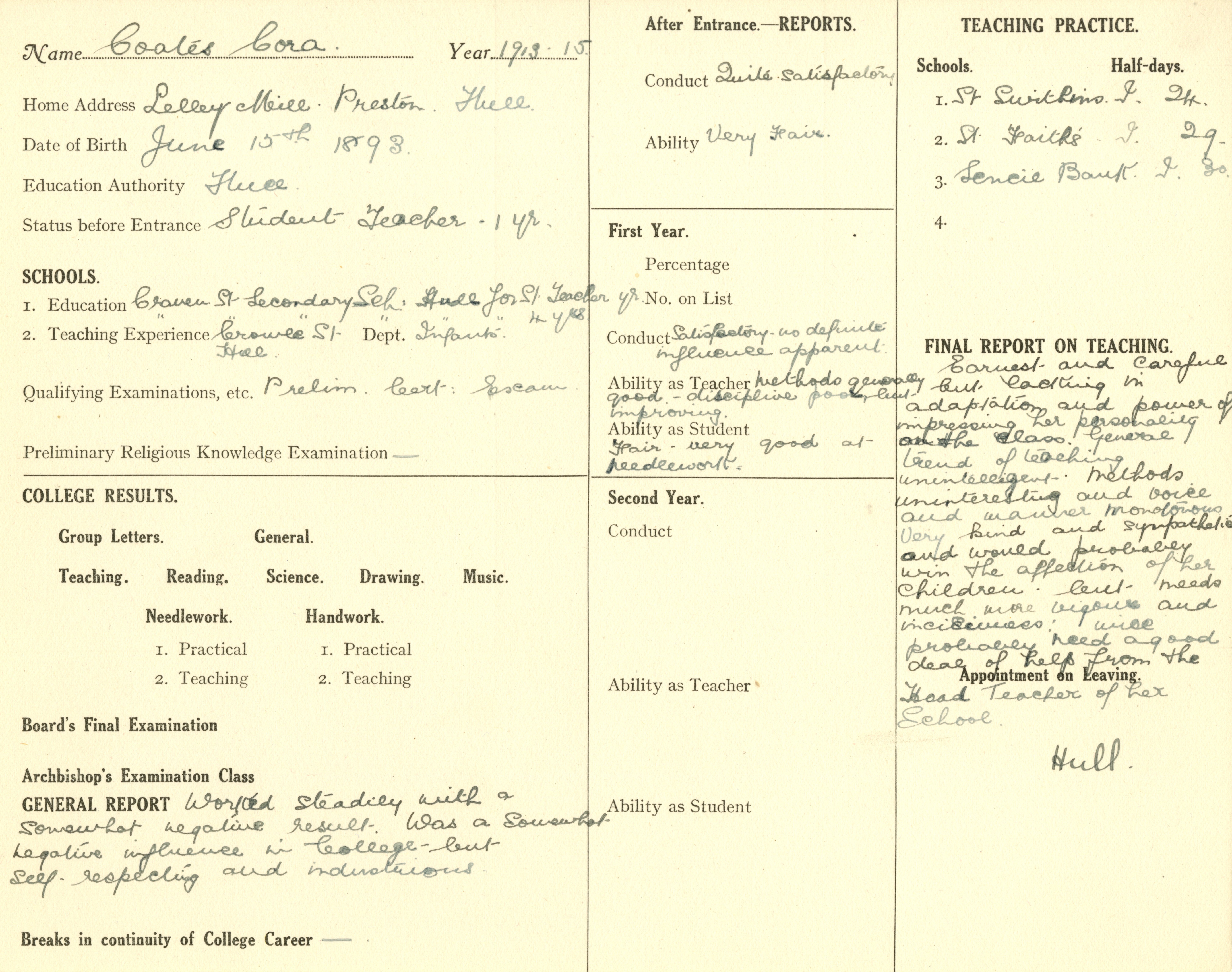 She is at Lelley Mill, Yorkshire. Her father is listed as ‘Flour Miller’. Cora and her mother are unlisted. Her brother, Henry, is listed as ‘Miller’s Son Working in Mill’. Her sister, Elizabeth, is listed as ‘Assistant Teacher Council School’. Her brother, John, is listed as ‘Clerk Manufacturers Office’. There is a servant, Mary Augusta Howells (b. 1894).