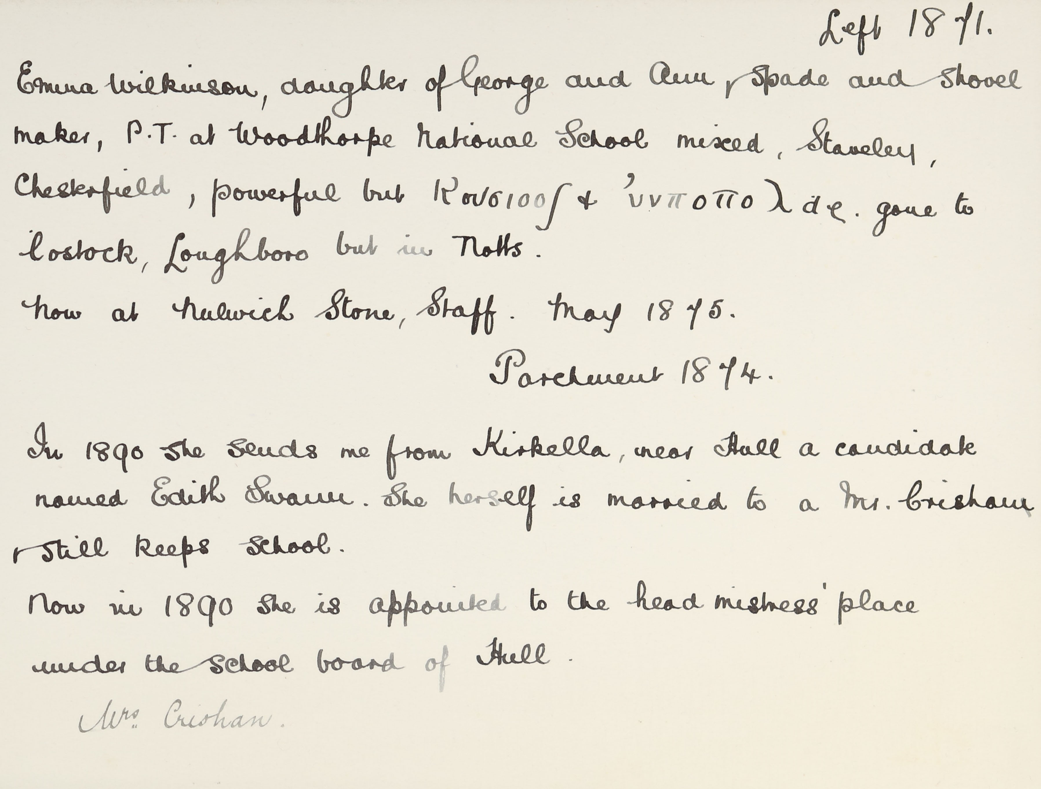She is at 8 Alderson Road, Sheffield. The head of the house is Sarah Turner (b 1824), an unlisted widow. Her daughter, Gertrude Turner (b. 1857), is listed as ‘Schoolmistress’. Emma is listed as ‘Boarder’ and ‘Schoolmistress’.
