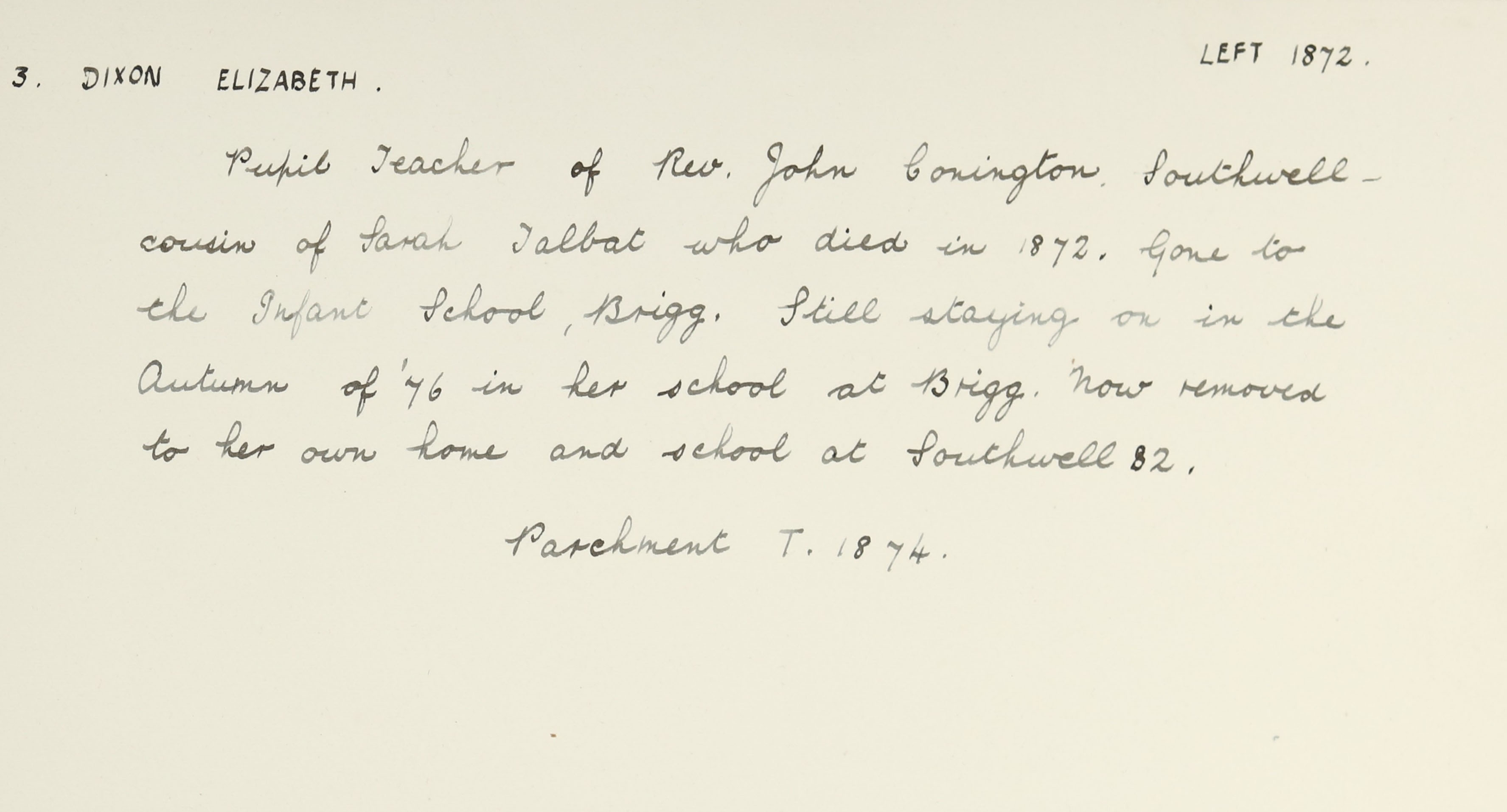 She is at Westhorpe, Southwell. Her grandmother, Sarah Dixon (b. 1796) is listed as widow and ‘Formerly Laundress’. Elizabeth is listed as ‘Schoolmistress’.