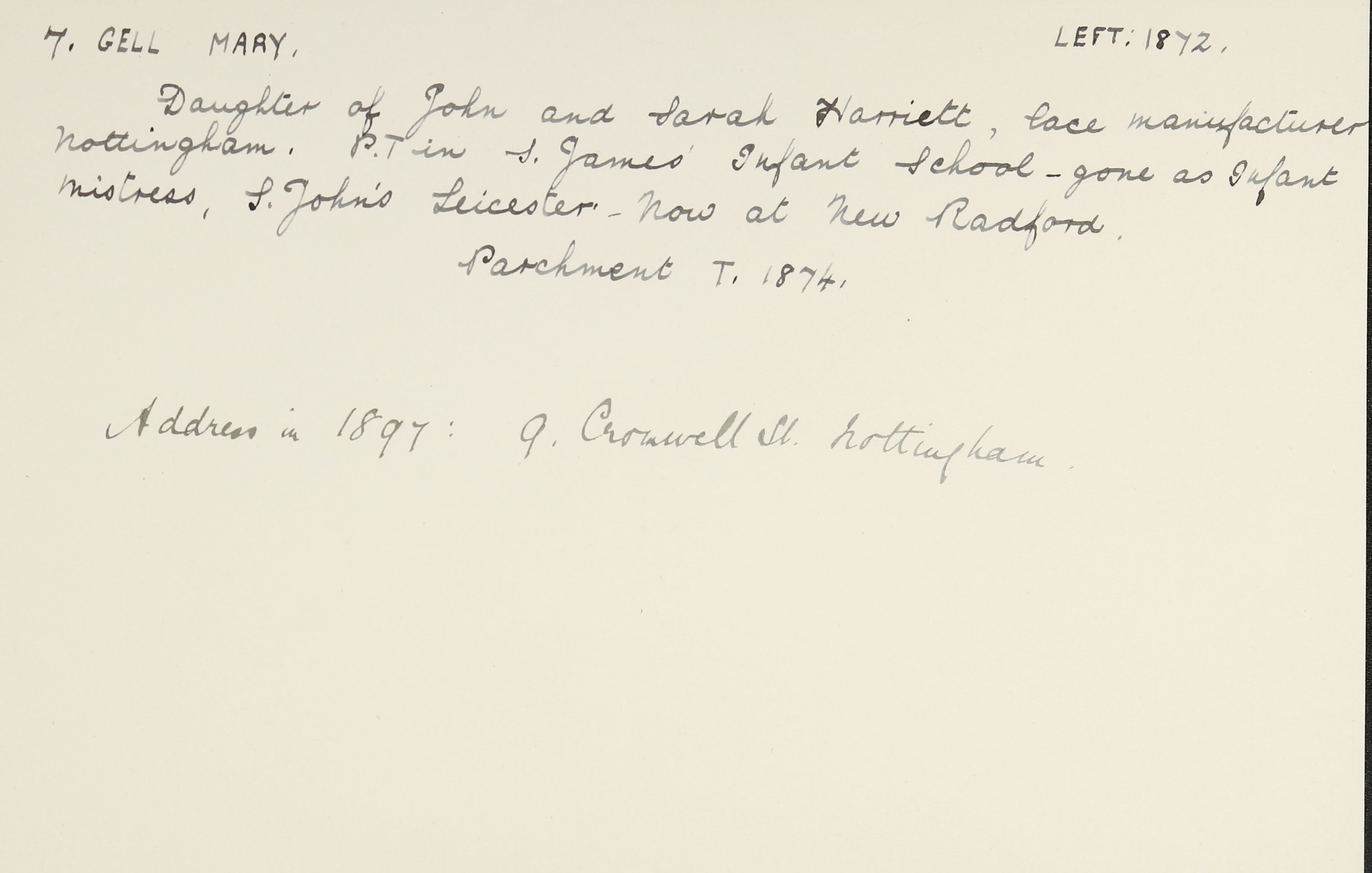 She is at 9 Cromwell Street, Nottingham. Her father is listed as ‘Retired Lace Maker’. Her mother is unlisted. Her sister, Sarah, is listed as ‘Employed in Lace Warehouse’. Mary and her sister, Ann, are listed as ‘Schoolmistress’. Her niece, Ada Gell (b. 1866), is listed as ‘Pupil Teacher’.