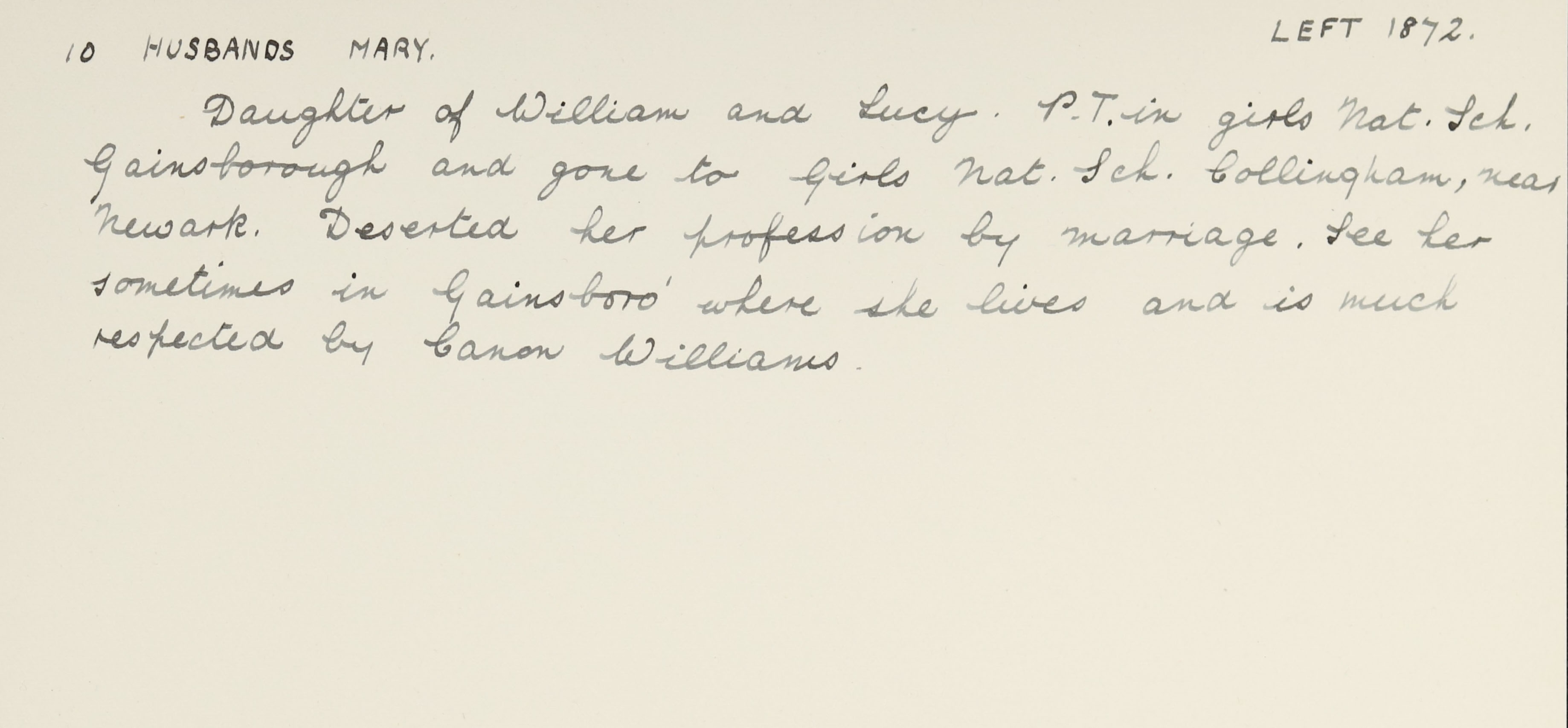 She is at Morton Terrace, Gainsborough. Her husband is listed as ‘Water Rate Collector’. Mary and her children (Florence, Edgar and Wilfred) are unlisted. Her daughter, Ethel, is listed as ‘Pupil Teacher Public Elementary School’. Her daughter, Constance, is listed as ‘Monitress in Public Elementary School’.