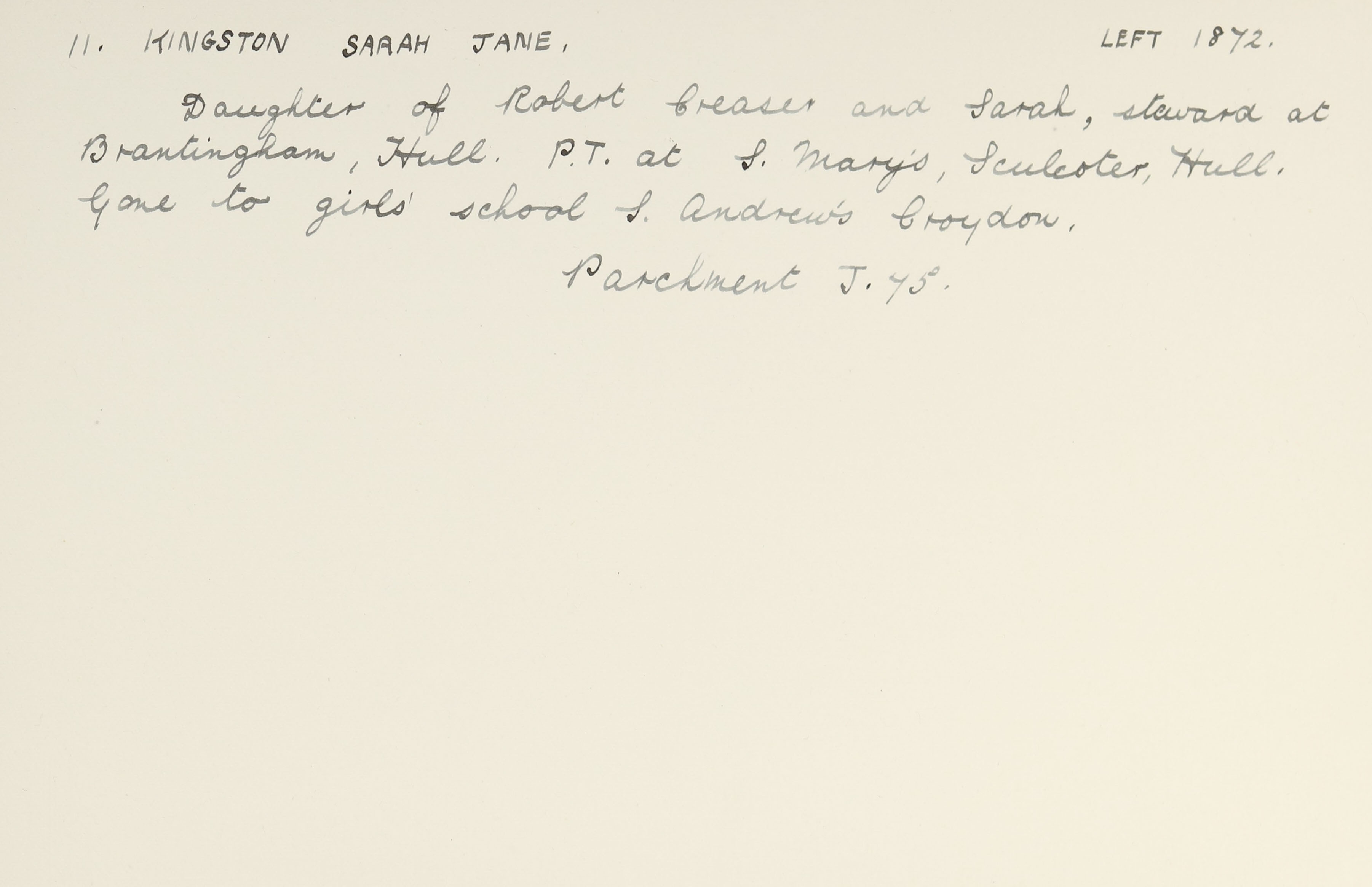 She is at Brantingham, Beverley. Her father is listed as ‘Sand Agent, Late Gardener’. Sarah Jane, her mother and sister, Anna, are unlisted.