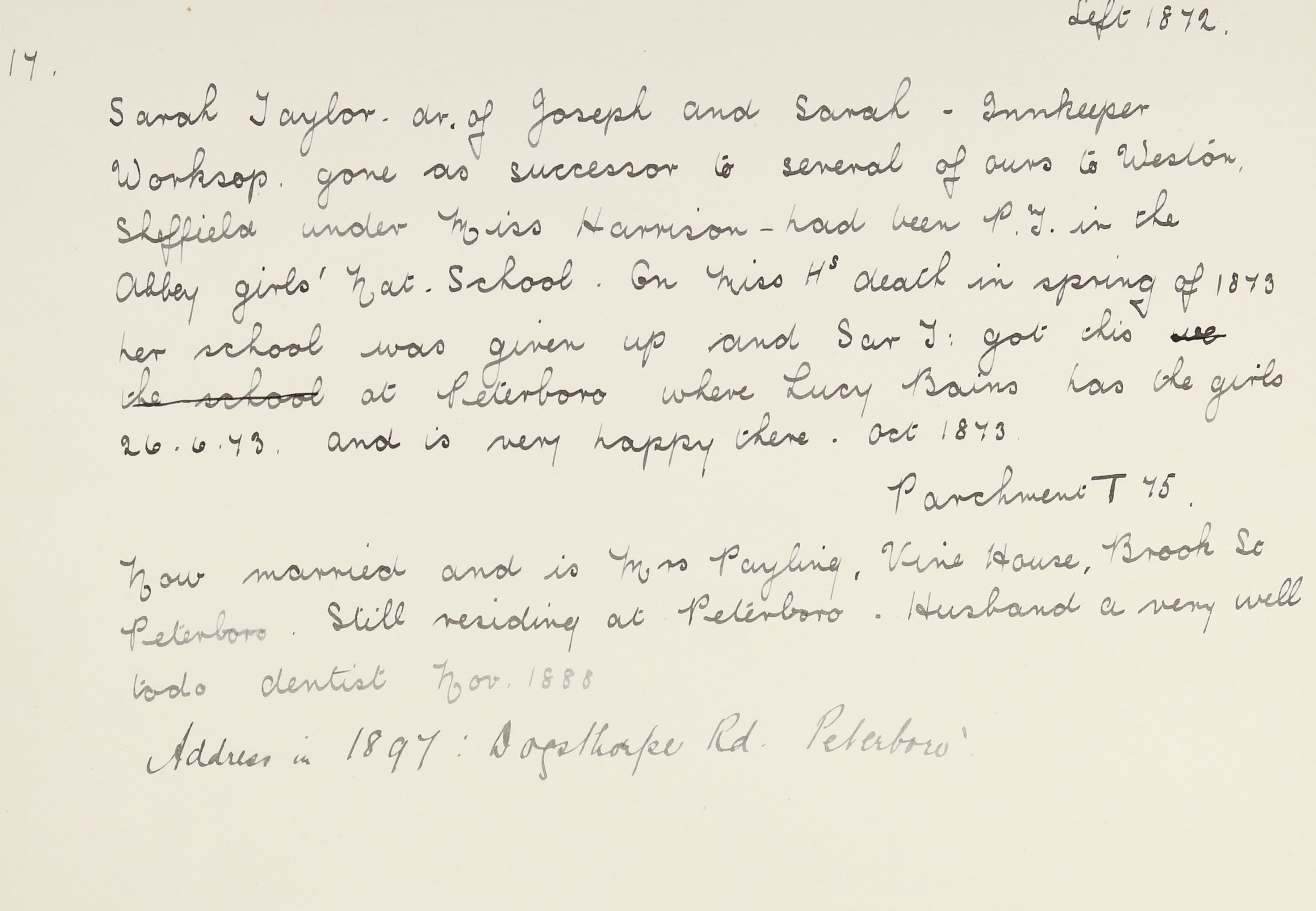 PAYLING, Sarah of 112 Park Road, Peterborough, widow died 31 May 1917. Probate Peterborough 18 July to Henry Hamilton Staton, dentist and George James Gray, chapter clerk. Effects £2949, 6s, 10d.