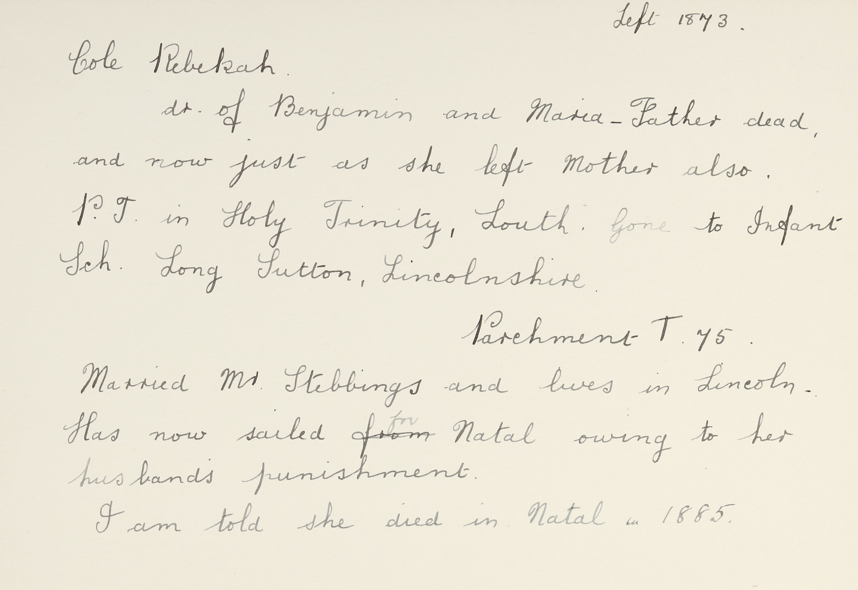 She is at 1 Eastfield Road, Louth. Her mother is listed as widow and ‘School Mistress’. Her brother, William, is listed as ‘Apprentice to an Ironmonger’. Her sister, Elizabeth, is listed as ‘Daily Governess’. Rebekah, her siblings (Maria and John) and a boarder, Mary A Scott (b. 1851), are unlisted.
