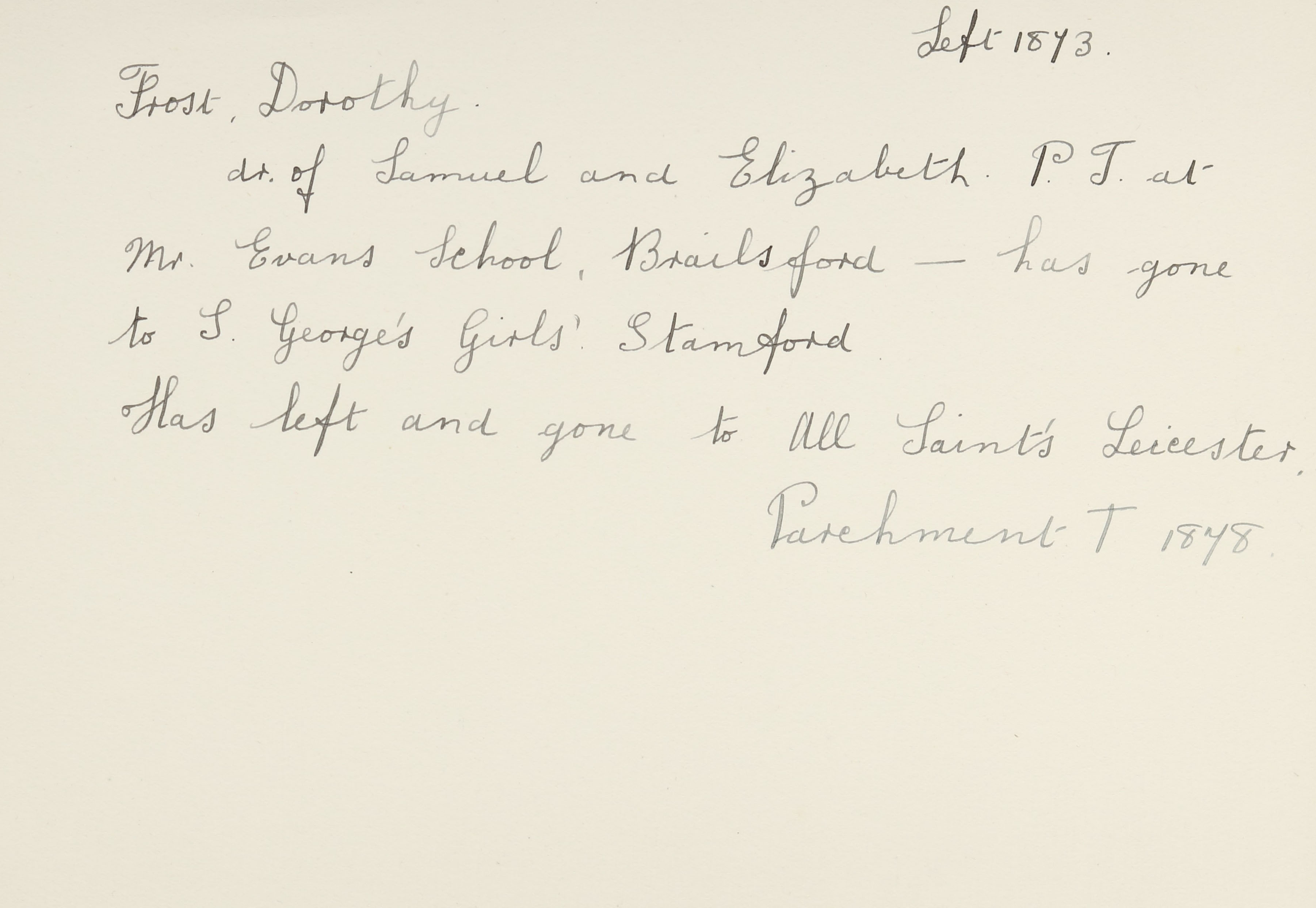 She is at Brailsford, Ashborne, Derbyshire. Her father is listed as ‘Farm Labourer’. Her mother is listed as ‘Dressmaker’. Her sister, Elizabeth, is listed as ‘Mother’s Assistant’. Dorothy is listed as ‘Pupil Teacher’. Her brother, Thomas, is unlisted.