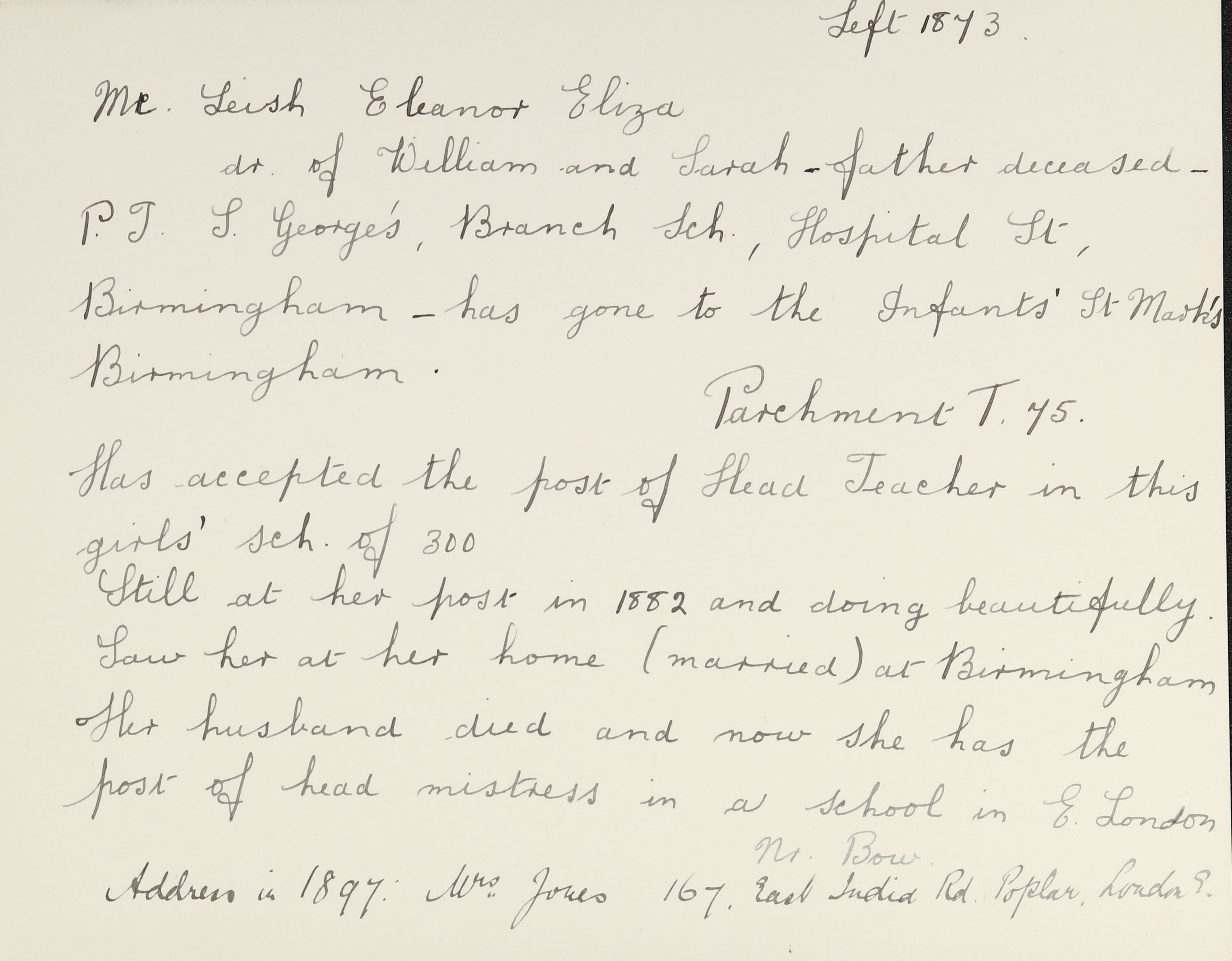 She is at 2 New Church Street, Birmingham. Her father is listed as ‘Scripture Reader’. Eleanor, her mother and sister, Sarah, are unlisted.
