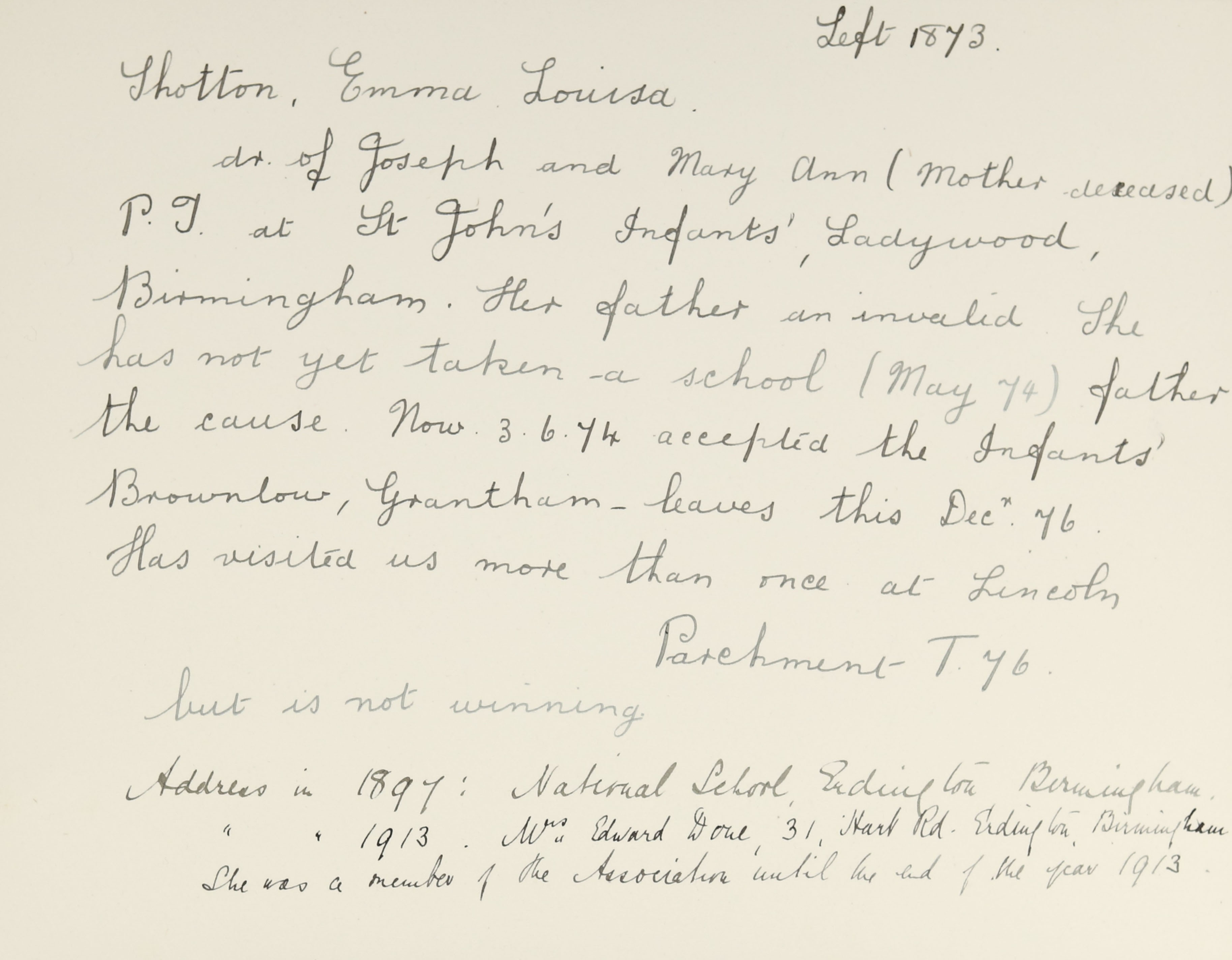 She is at 20 Sycamore Road, Aston. Her father is listed as widower and ‘Pearl B Turner (Button)’. Emma is listed as ‘School Mistress’. Her brother, William, is listed as ‘Clerk’.