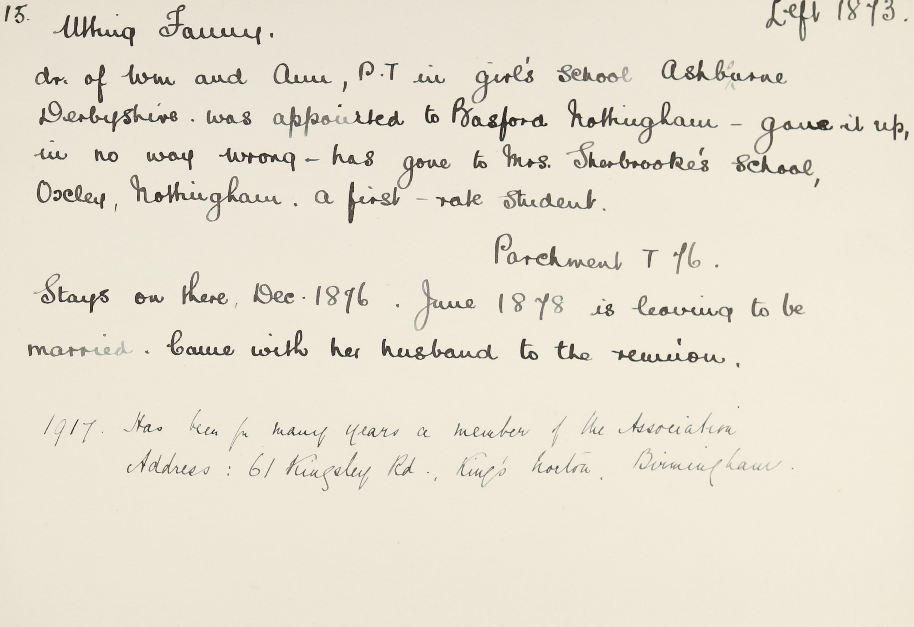 She is at 61 Kingsley Road, Kings Norton. Fanny is unlisted. Her daughter, Eleanor, is listed as ‘Eleanor School Teacher’.