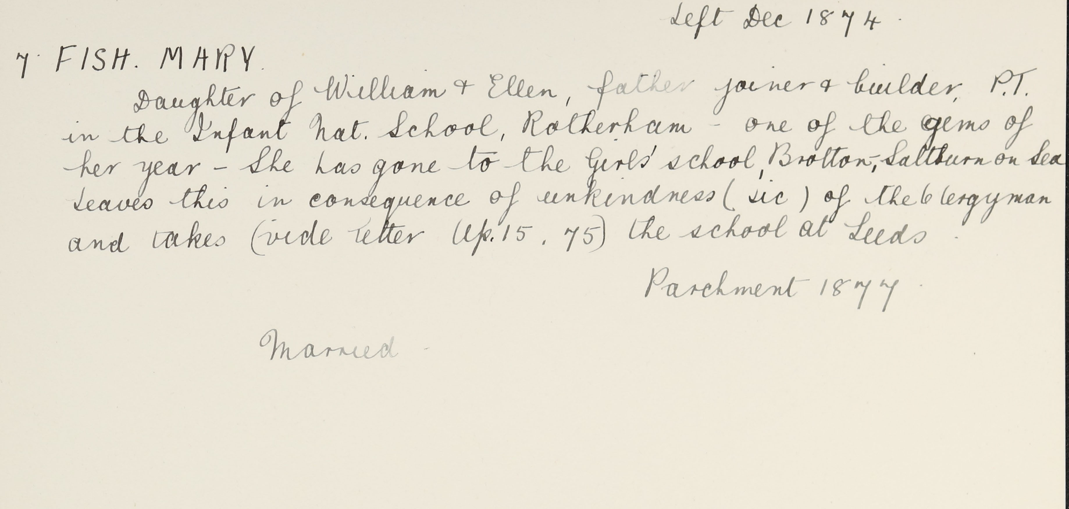 She is at Tenter Street, Kimberworth, Rotherham. Mary is listed as ‘Pupil Teacher’. Her father is listed as ‘House Carpenter’. Her mother and sisters, Ann and Ellen, are unlisted.