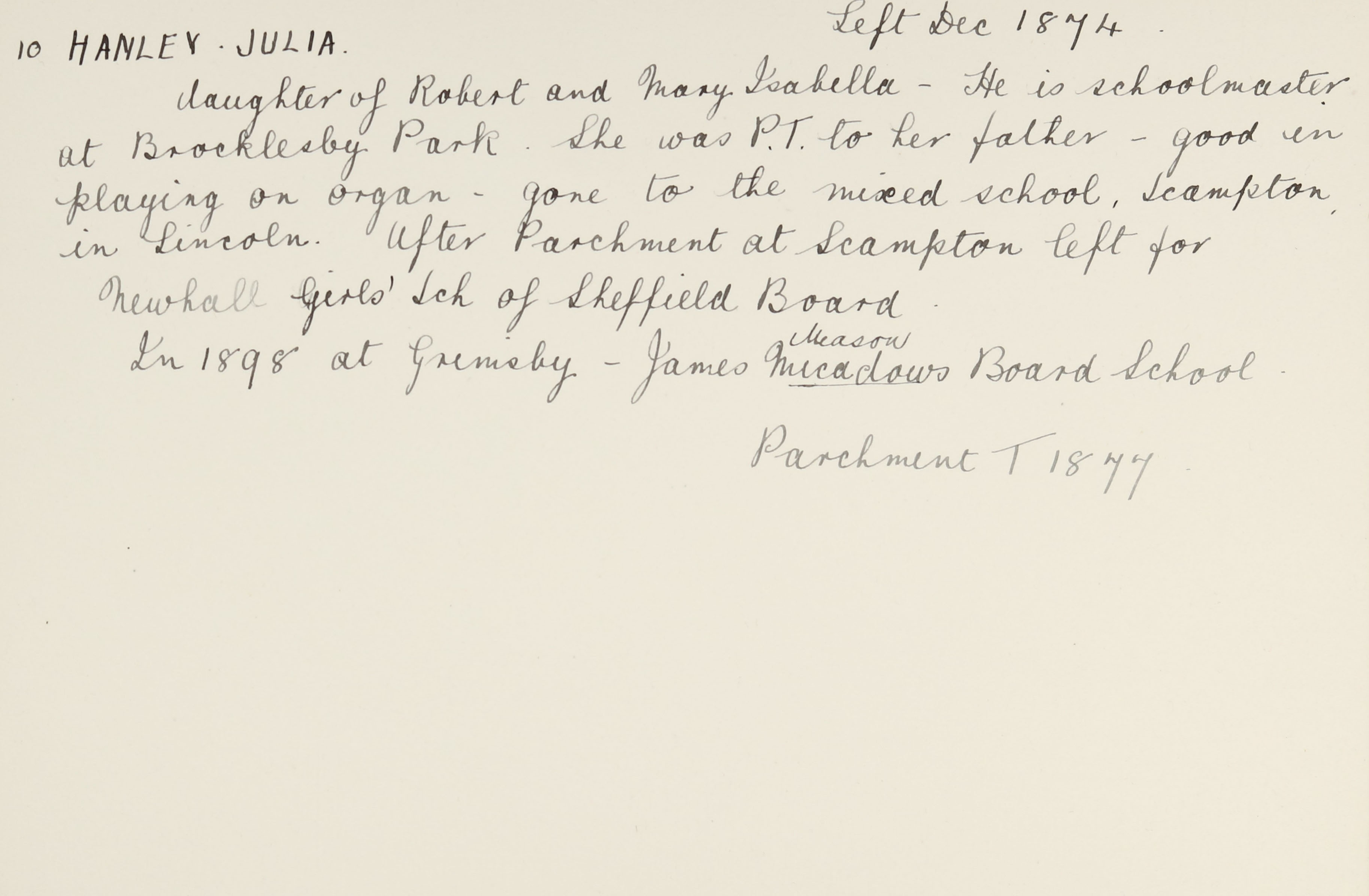 She is at Great Limber, Caistor. Julia, her father and sisters (Mary and Adelaide) are listed as ‘Teacher of Elementary School’. Her mother is unlisted.