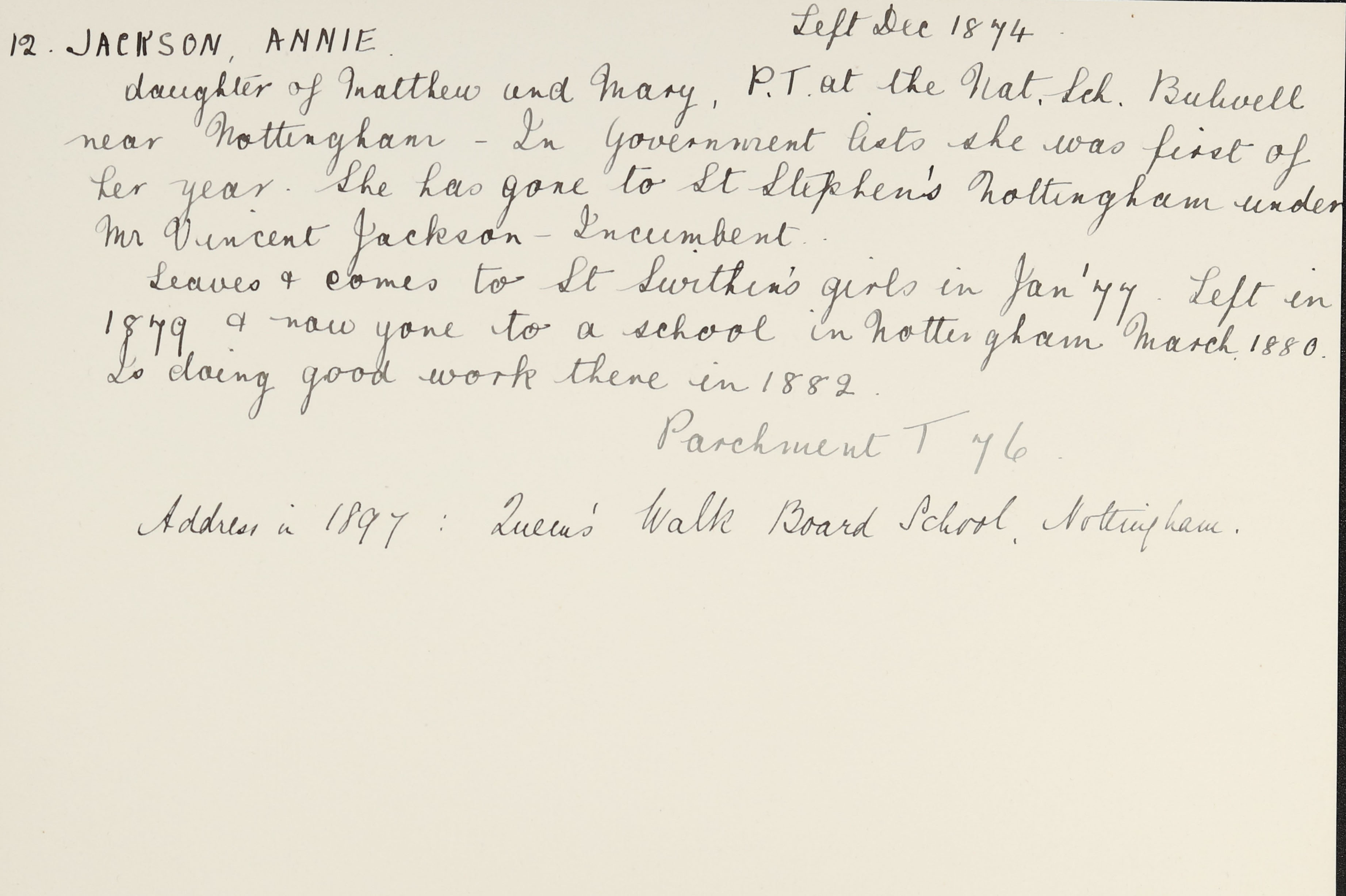 Address is listed as Queen's Walk Board School, Nottingham.