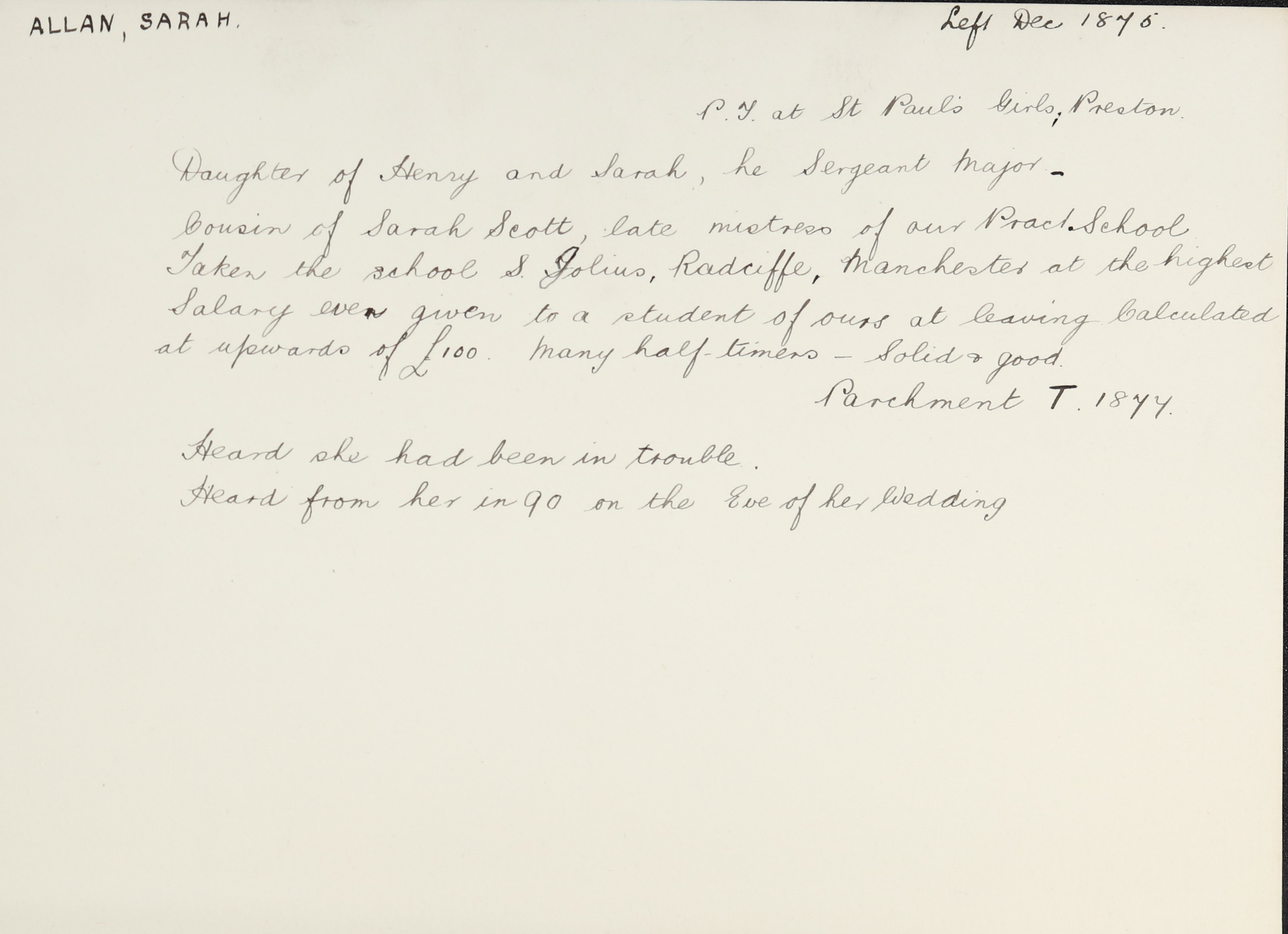 She is at St. Paul Square, Preston. Her mother is an unlisted widow. Her brother, henry, is listed as ‘Printer Compositor’. Sarah and her brother, George, listed as ‘Pupil Teacher’. Her siblings (Alexander, John and Ellen) are unlisted. Sarah Allan (b. 1842) and Jean McTaggart (b. 1842) are lodgers and listed as ‘Government Certificated Teacher’.