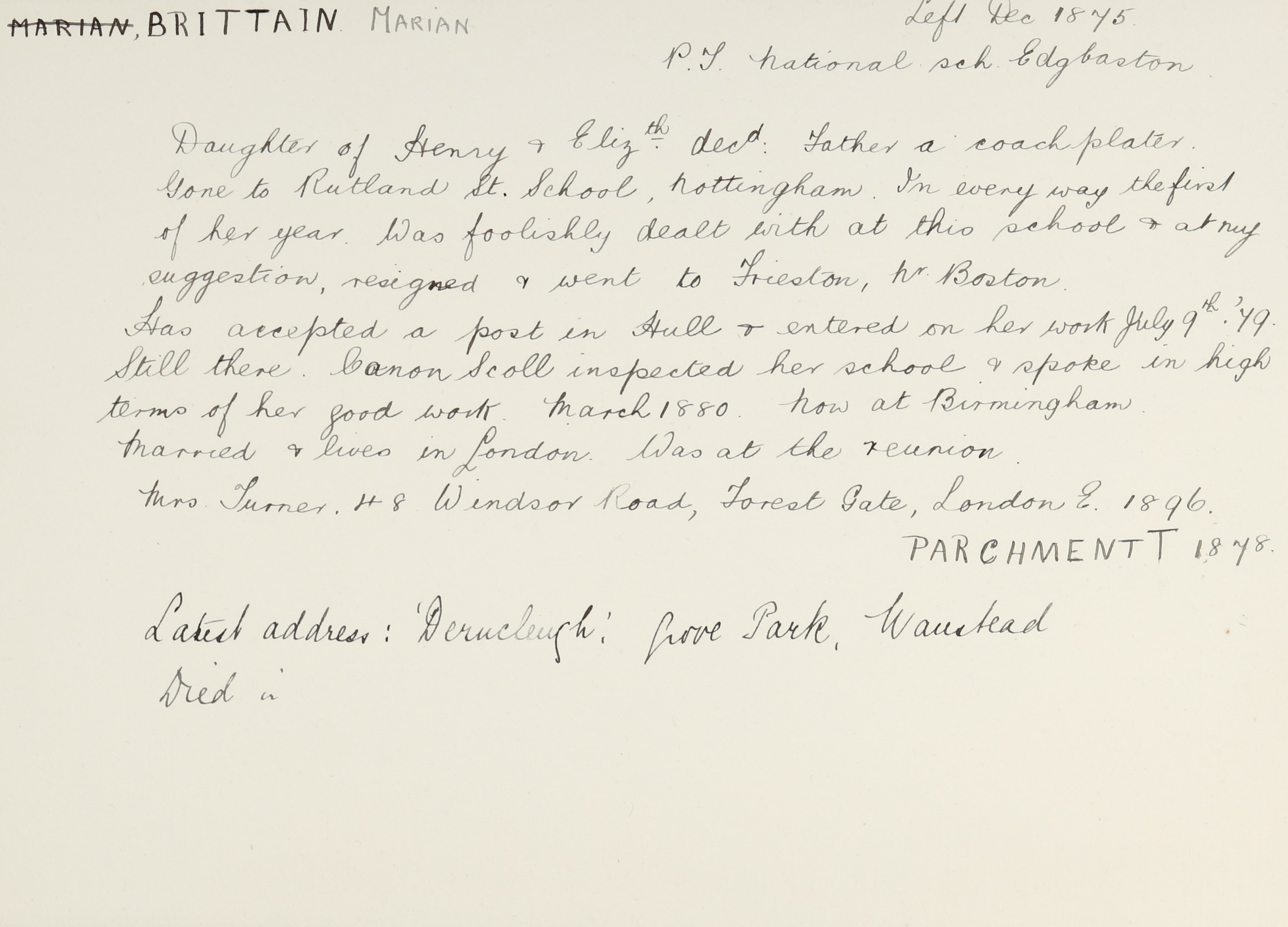 She is at Carlyle Road, Edgbaston. Her father is listed as ‘Coach Plater’. Marian is listed as ‘Governess’. Her sisters, Lizzie and Annie, are listed as ‘Pupil Teacher’. Her step-mother and halfsiblings (Frank, William, Millie, Kate, Ada, Tom) are unlisted.