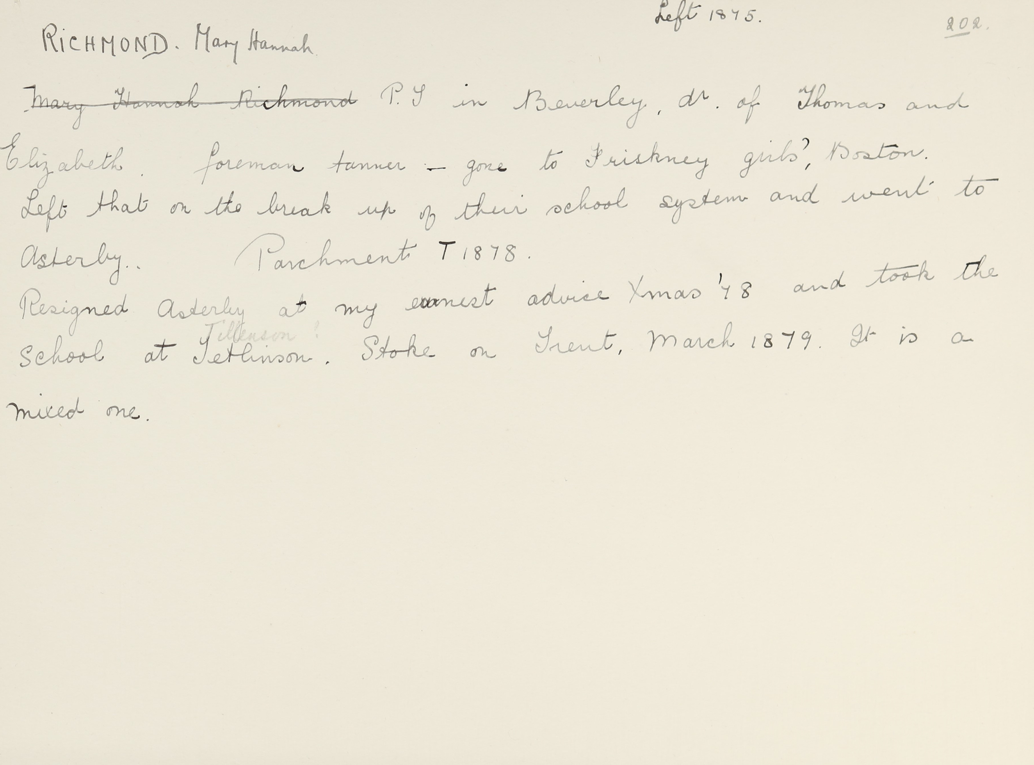 She is at Keld Gate, Beverley. Her father is listed ‘Tanner Foreman’. Her brother, James, is listed as ‘Tanner Clerk’. Mary is listed as ‘Pupil Teacher’. Her mother and siblings (Martha, Thomas and Ann) are unlisted.