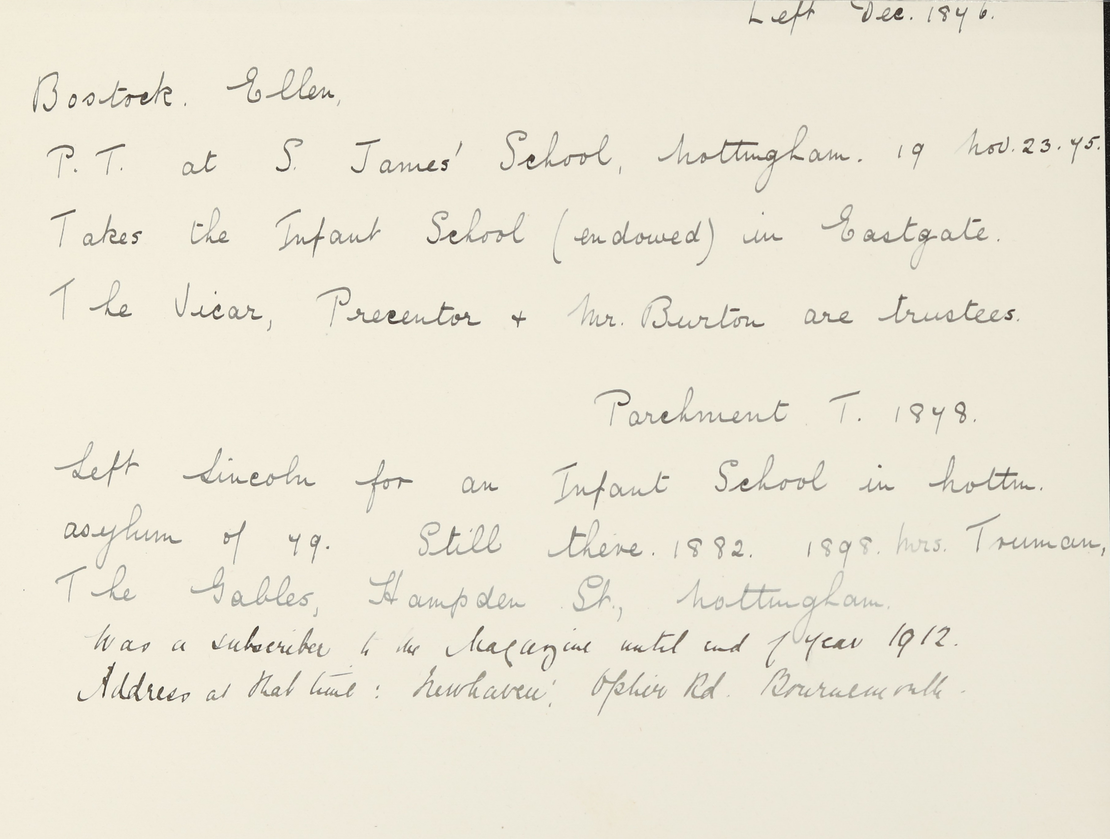 She is at Ilkeston Road, Radford. Her father is listed as ‘Hosier’. Her sister, Sarah, is listed as ‘Hosiery Mender’. Her sister, Mary and Eliza, are listed as ‘Brass Bobbin Winder Lace’. Her brother, William, is listed as ‘Overlooker Lace Trade’. Ellen is listed as ‘Pupil Teacher’. Her mother and brothers (Edward, Thomas and Henry) are unlisted.