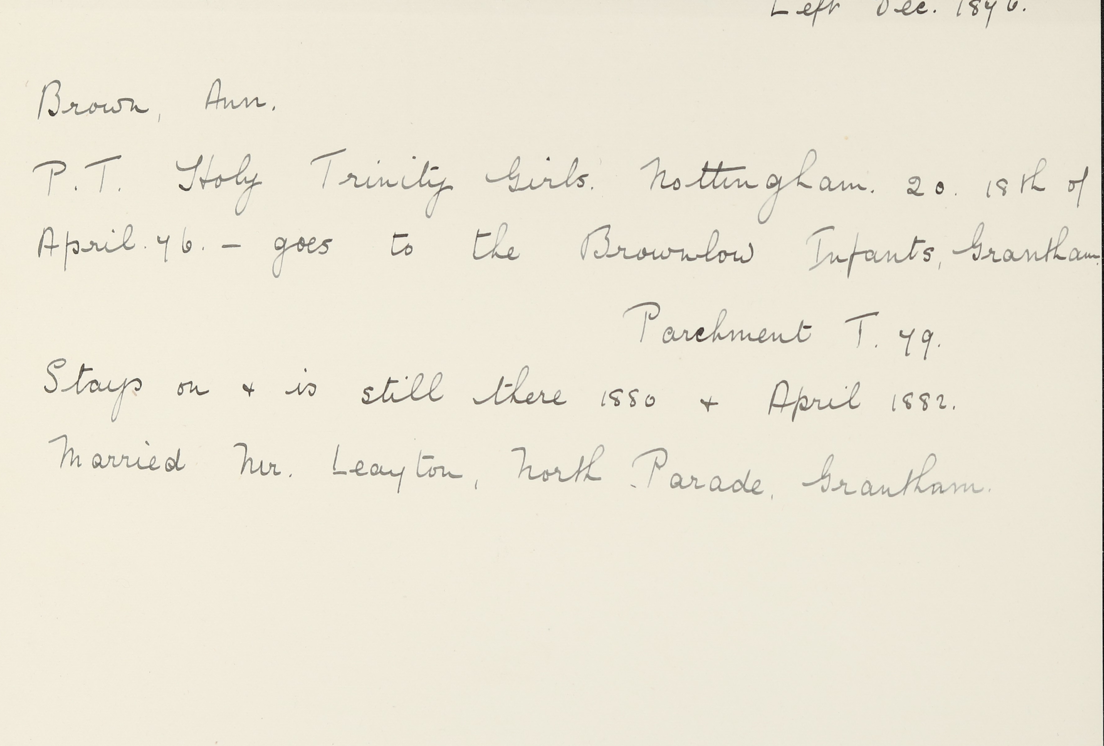 She is at Castlegate, Grantham. Annie and Mary Alice Travis (b. 1856) [LDTC 1876] are listed as ‘Elementary Teacher’. Rose Ellen Travis (b. 1866) is listed as ‘Vocalist’.
