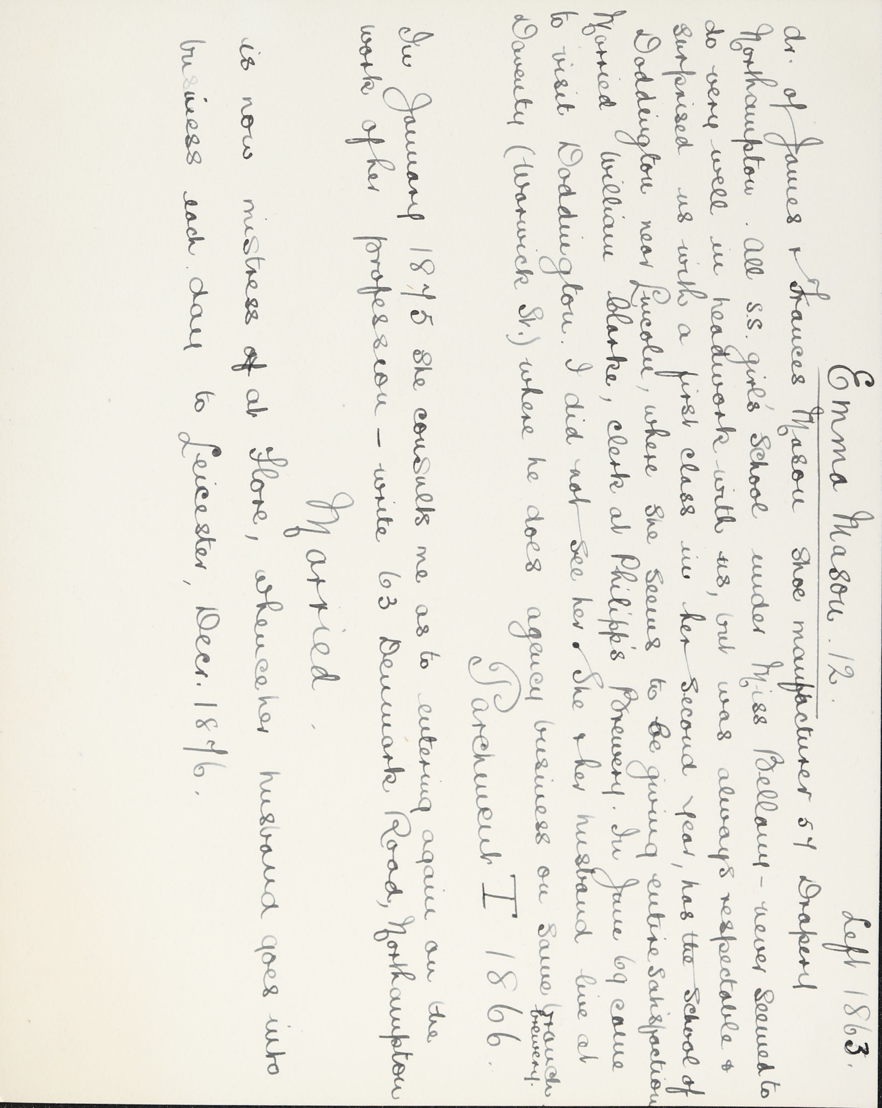She is at Bradshaw Street, Northampton. Her father is listed as ‘Shoe Manufacturer Employing 15 Men’. Her brother, John, is listed as ‘Shoe Manufacturer’. Emma, her mother and sisters (Elizabeth and Frances) are unlisted.