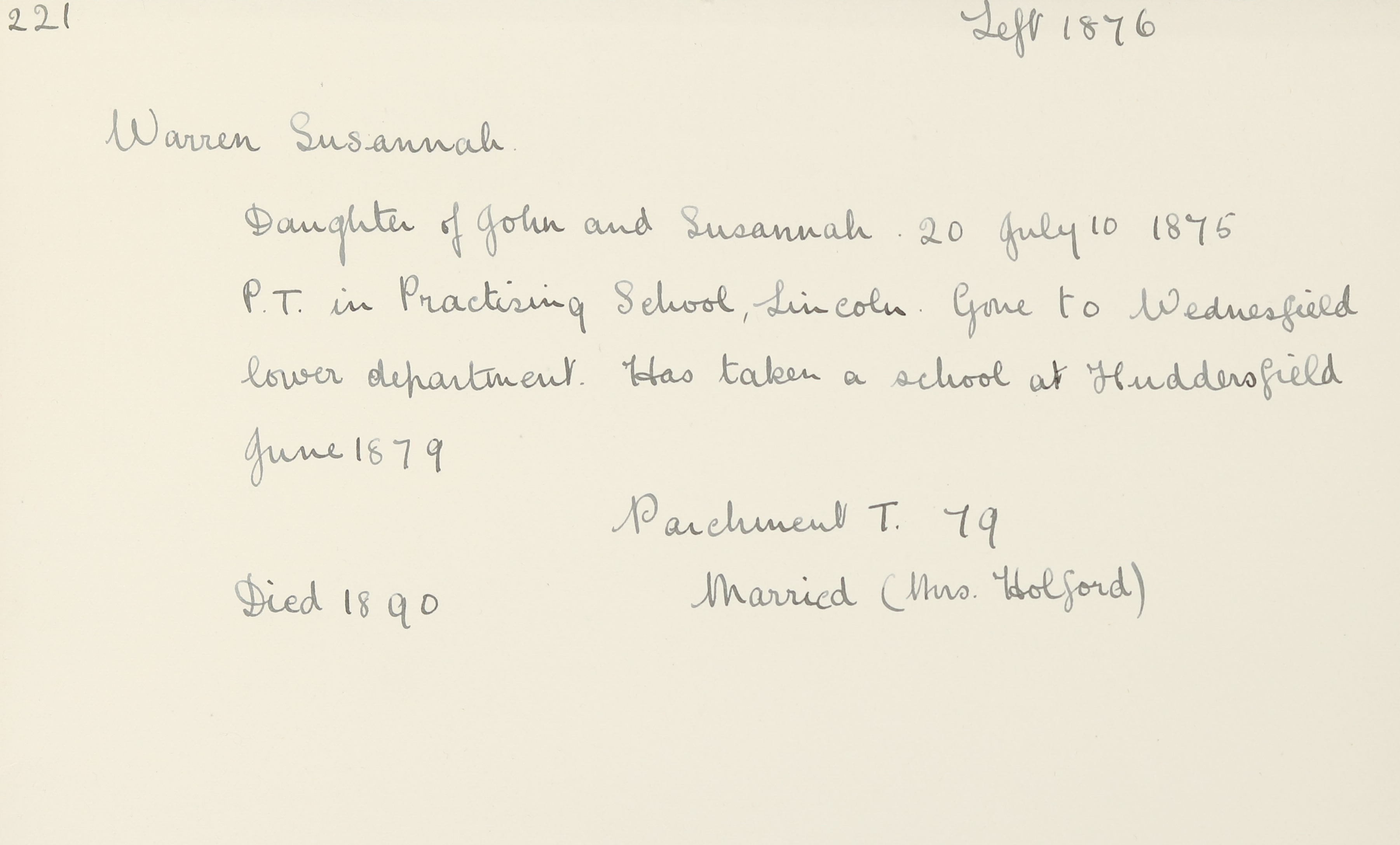 She is at Church Lane, Lincoln as a boarder. Mark Brown (b. 1828) is listed as ‘Labourer at Ironworks’. His wife, Jane Brown (b. 1841), and daughters, Ada Brown (b. 1867) and Emily J Brown (b. 1869), are unlisted. Sarah Thorpe (b. 1853) [LDTC 1873] and Susanna are listed as boarders and ‘Pupil Teacher’.