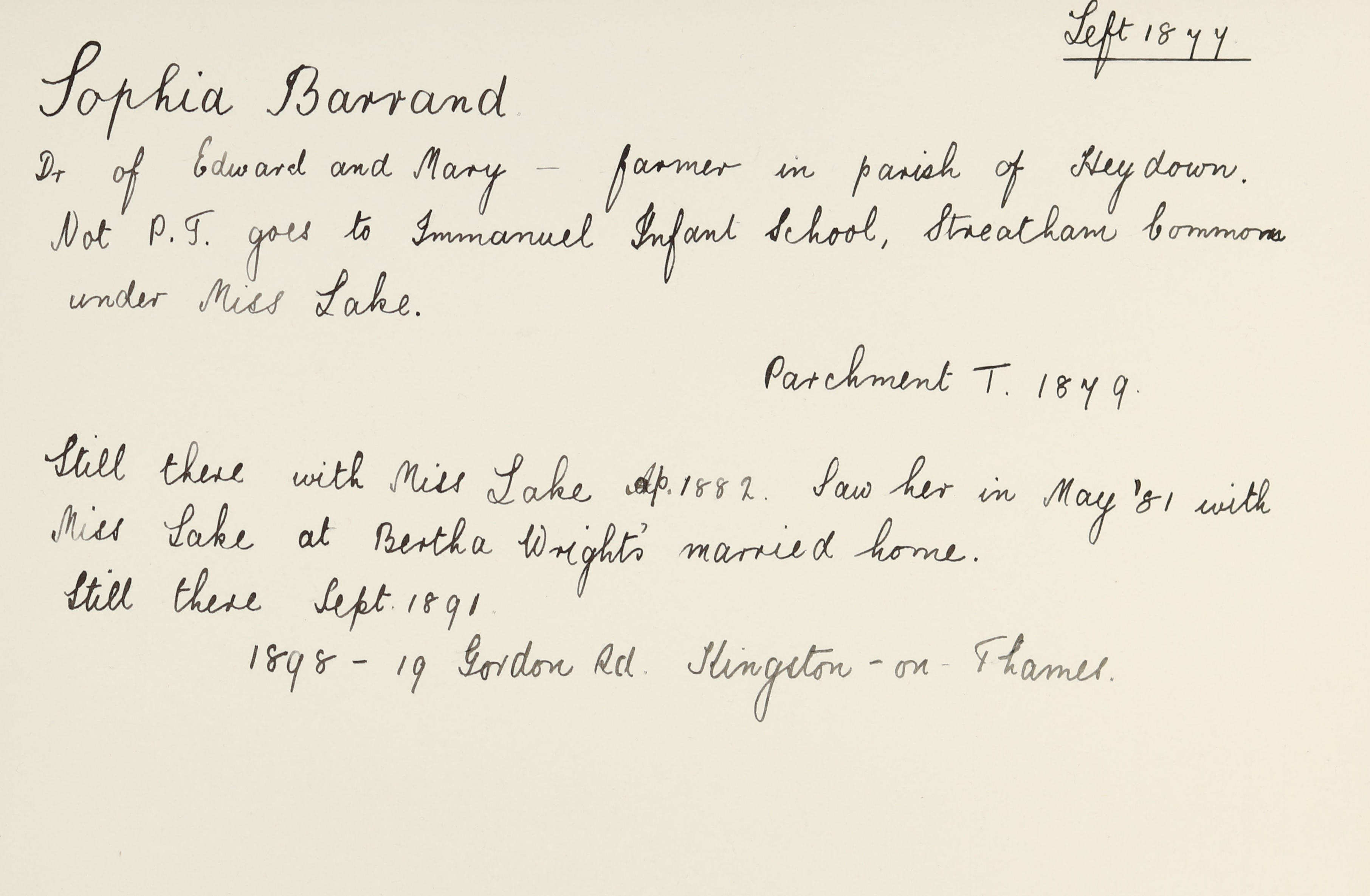 She is at School House, Streatham. Sarah A Lake (b. 1847) [LDTC 1866] and Sophia are listed as ‘Schoolmistress’.