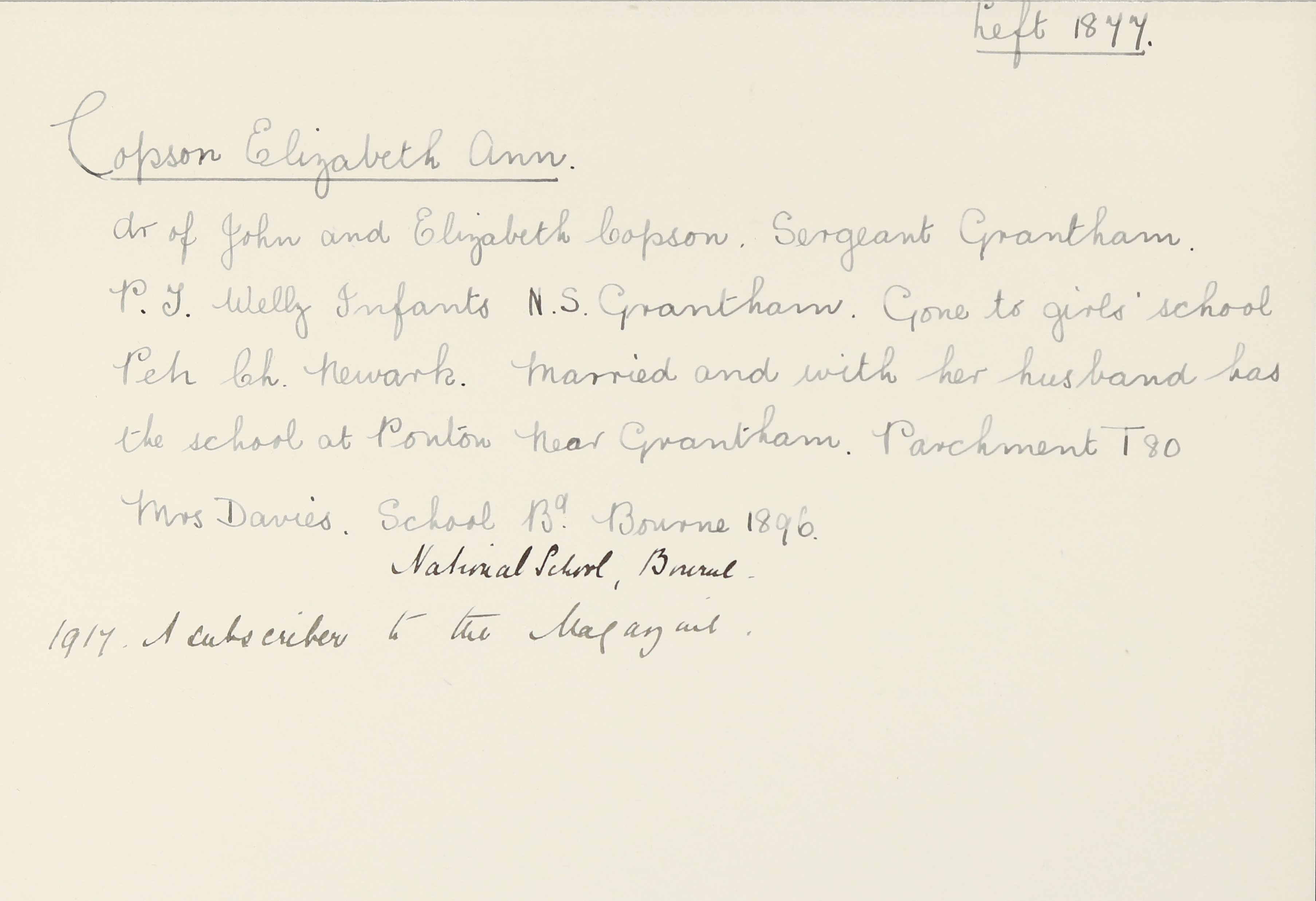 She is at Royal South Lincoln Militia Barracks, Harrowby. Her father is listed as Staff Sergeant Royal South Lincolnshire Militia’. Elizabeth is listed as ‘Elementary Schoolmistress’. Her mother and her brother, Edward, are unlisted.